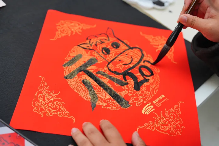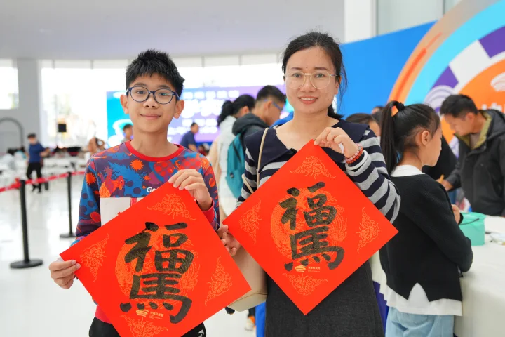 孩子们争相围在桌前,学着老师的笔势,画下自己心中的“马年福”。一张张红福铺满长案,墨迹未干便被捧在掌心。年味与童趣,就这样一并带回了家。