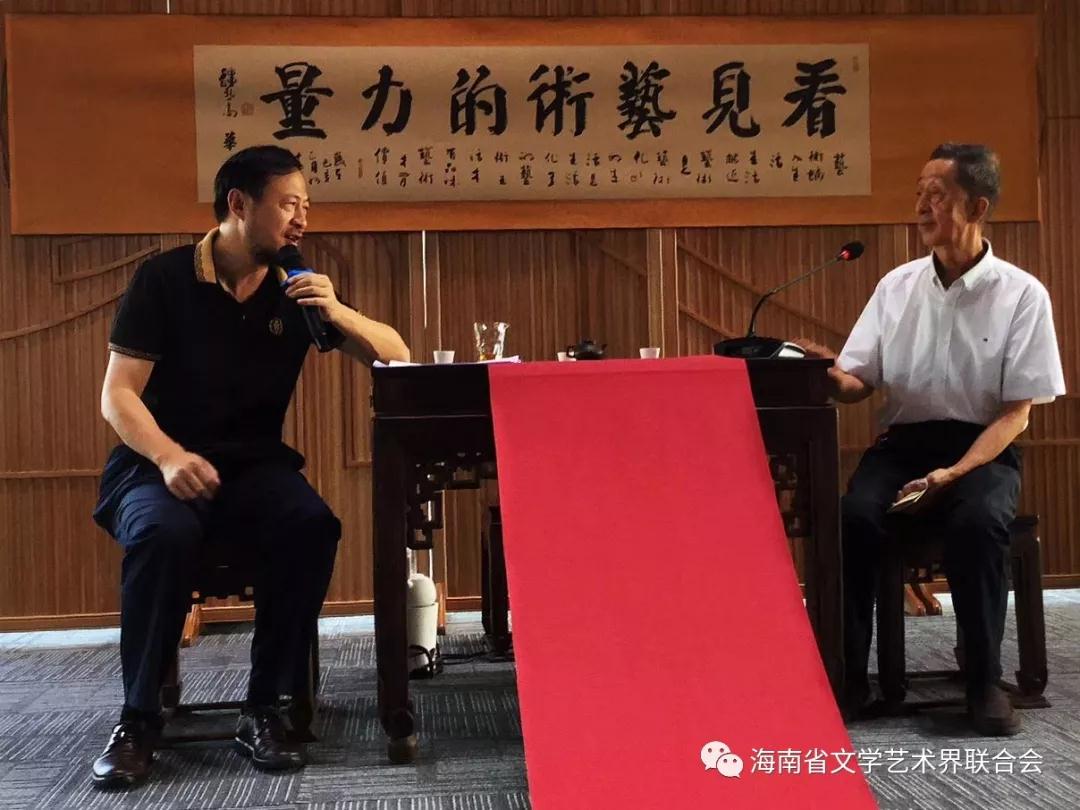 海南省旅琼文艺家协会副主席兼秘书长、省评论家协会副主席马良(左)主持“看见艺术的力量”——迎春人文艺术沙龙学术交流