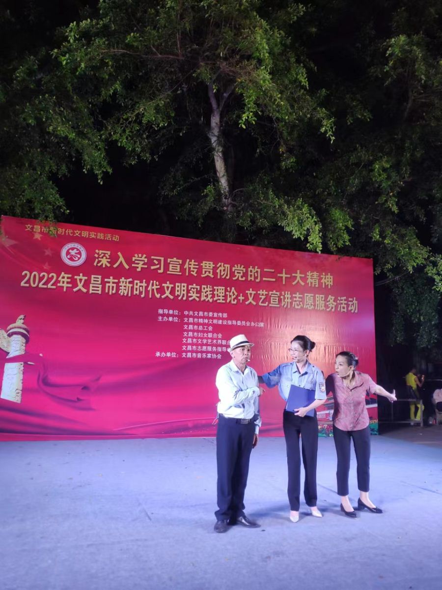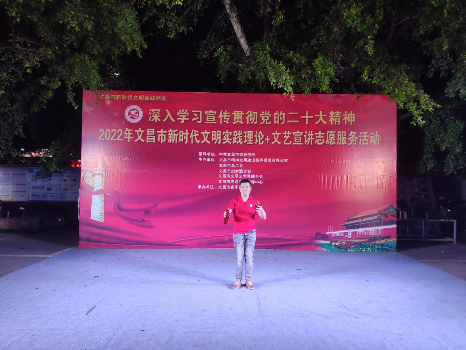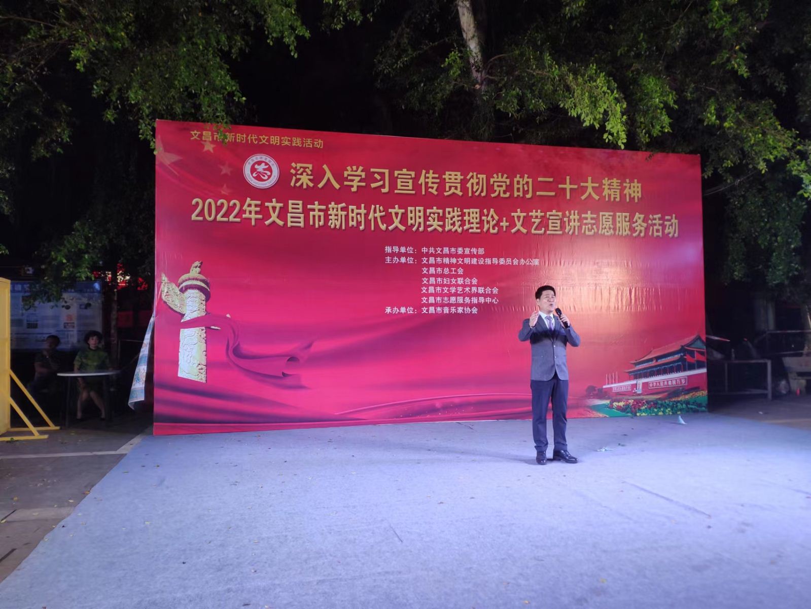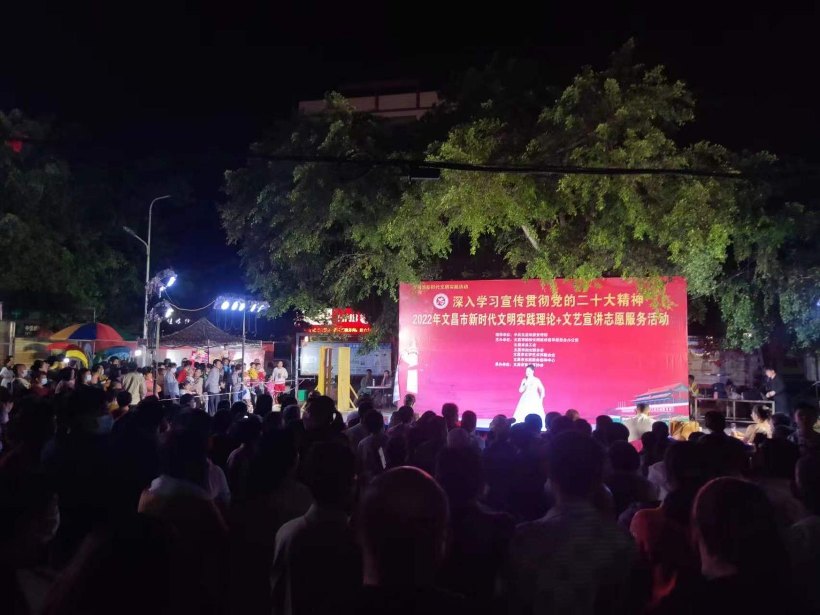 为进一步深入学习贯彻落实习近平新时代中国特色社会主义思想,发挥文艺的独特优势,激发和凝聚广大干部职工群众的干事创业热情,以更加饱满的豪情斗志投入到加快文昌国际航天城建设中来,在中共文昌市委宣传部指导下,文昌市总工会、文昌市妇联、文昌市文联决定,组织文艺宣讲队伍,围绕党的二十大精神学习宣传、乡村振兴、重点项目建设、创建全国文明城市、“扫黄打非”、关爱未成年人等全市重点工作,于2022年11月16日晚上8:00在文昌市东郊镇椰树村委会开展2022年文昌市新时代文明实践系列活动。