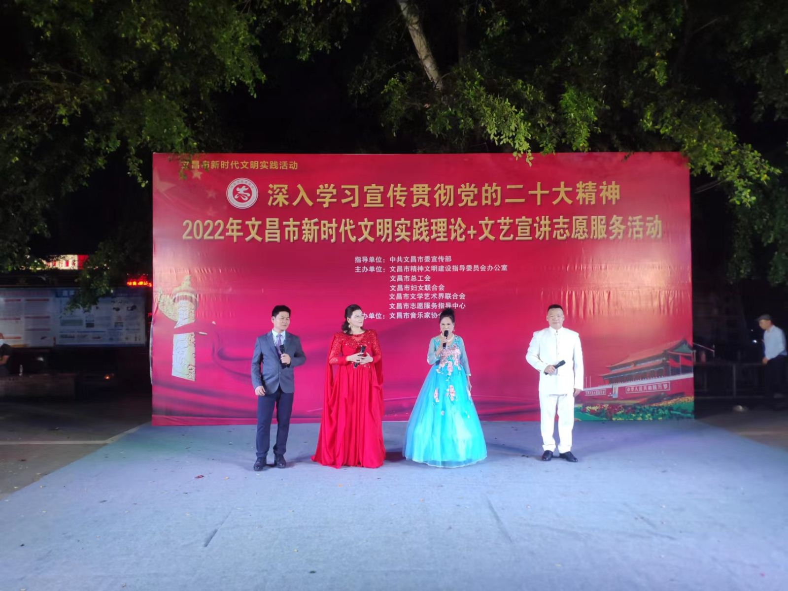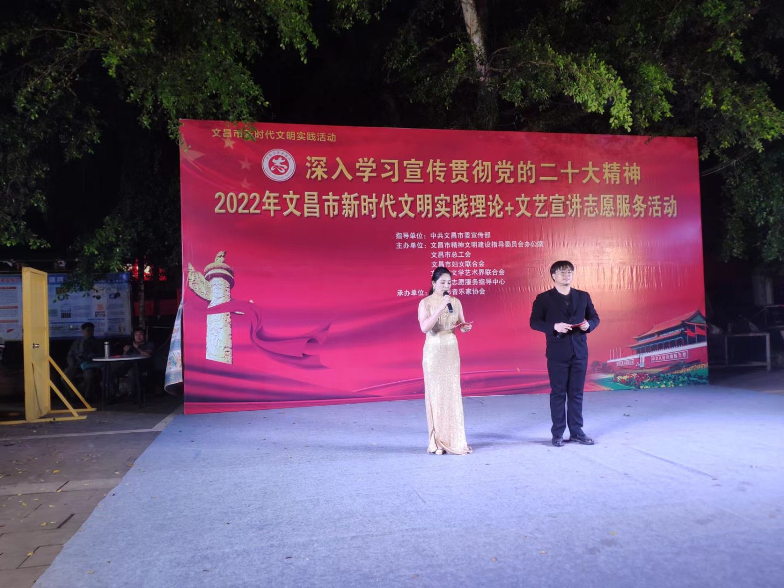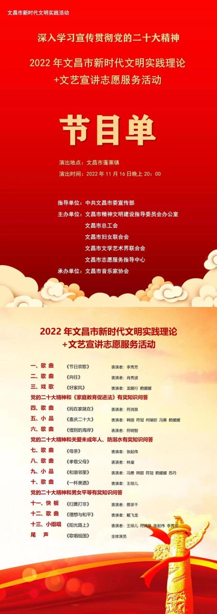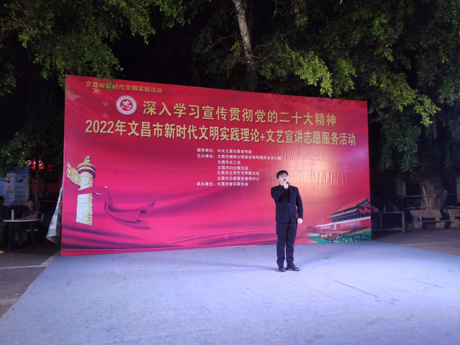 为进一步深入学习贯彻落实习近平新时代中国特色社会主义思想,发挥文艺的独特优势,激发和凝聚广大干部职工群众的干事创业热情,以更加饱满的豪情斗志投入到加快文昌国际航天城建设中来,在中共文昌市委宣传部指导下,文昌市总工会、文昌市妇联、文昌市文联决定,组织文艺宣讲队伍,围绕党的二十大精神学习宣传、乡村振兴、重点项目建设、创建全国文明城市、“扫黄打非”、关爱未成年人等全市重点工作,于2022年11月16日晚上8:00在文昌市东郊镇椰树村委会开展2022年文昌市新时代文明实践系列活动。