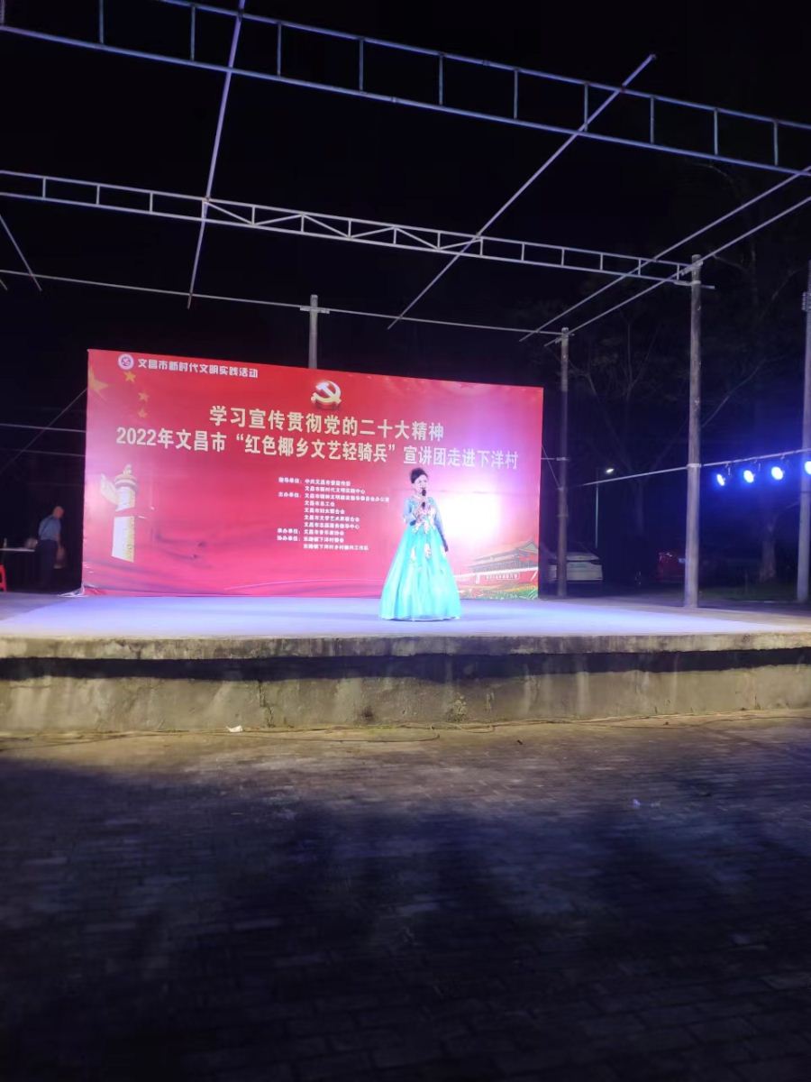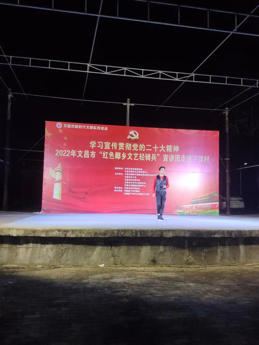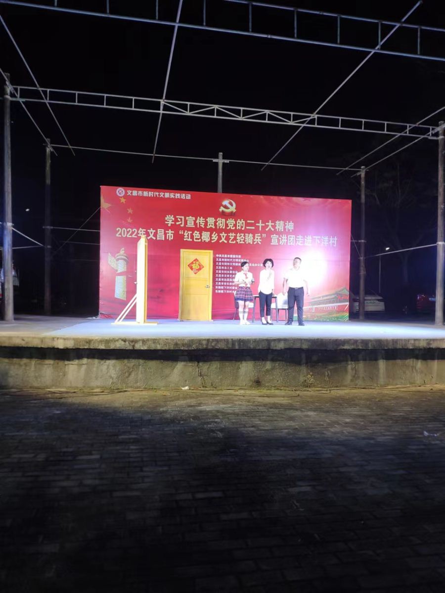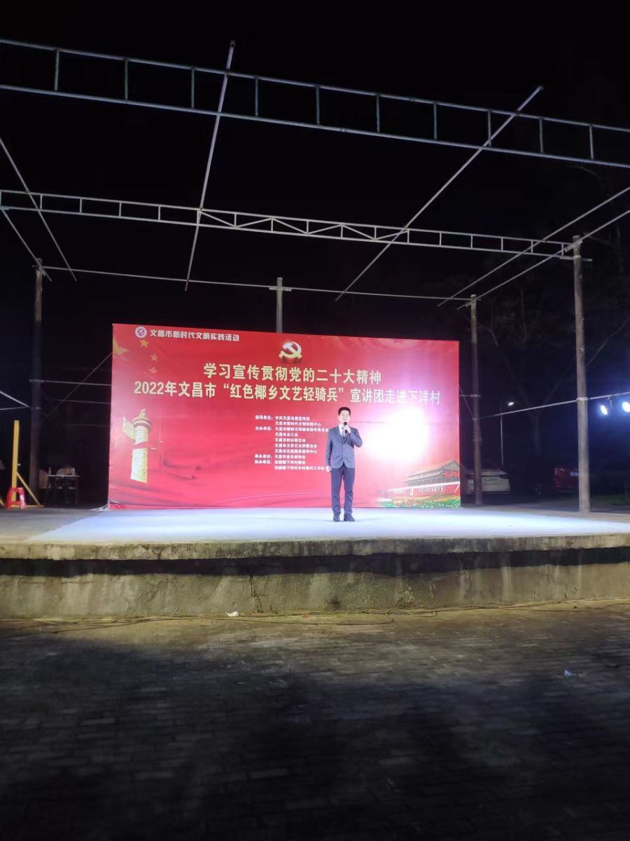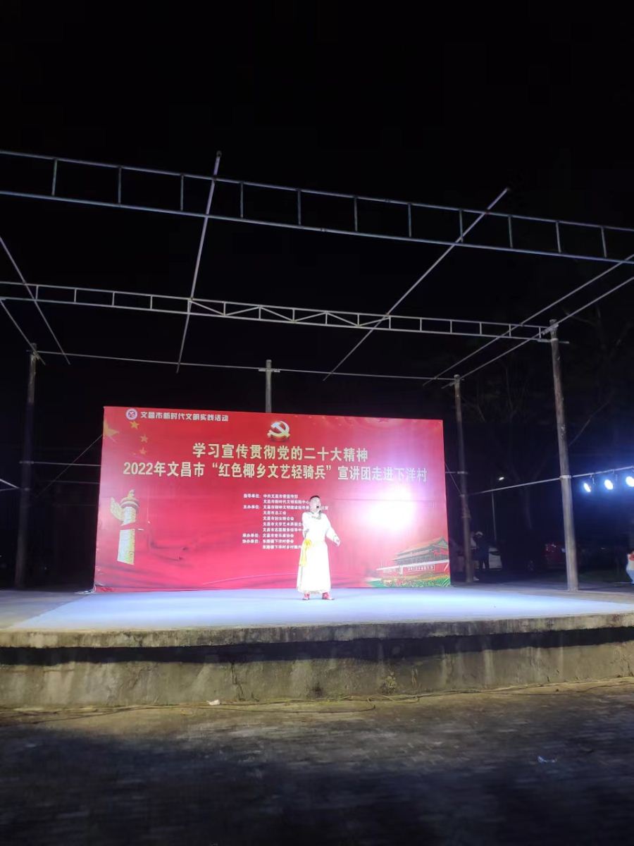 为进一步深入学习贯彻落实习近平新时代中国特色社会主义思想,发挥文艺的独特优势,激发和凝聚广大干部职工群众的干事创业热情,以更加饱满的豪情斗志投入到加快文昌国际航天城建设中来,在中共文昌市委宣传部指导下,文昌市总工会、文昌市妇联、文昌市文联决定,组织文艺宣讲队伍,围绕党的二十大精神学习宣传、乡村振兴、重点项目建设、创建全国文明城市、“扫黄打非”、关爱未成年人等全市重点工作,于2022年11月18日晚上8:00在文昌市东路镇下洋村委会开展2022年文昌市新时代文明实践系列活动。