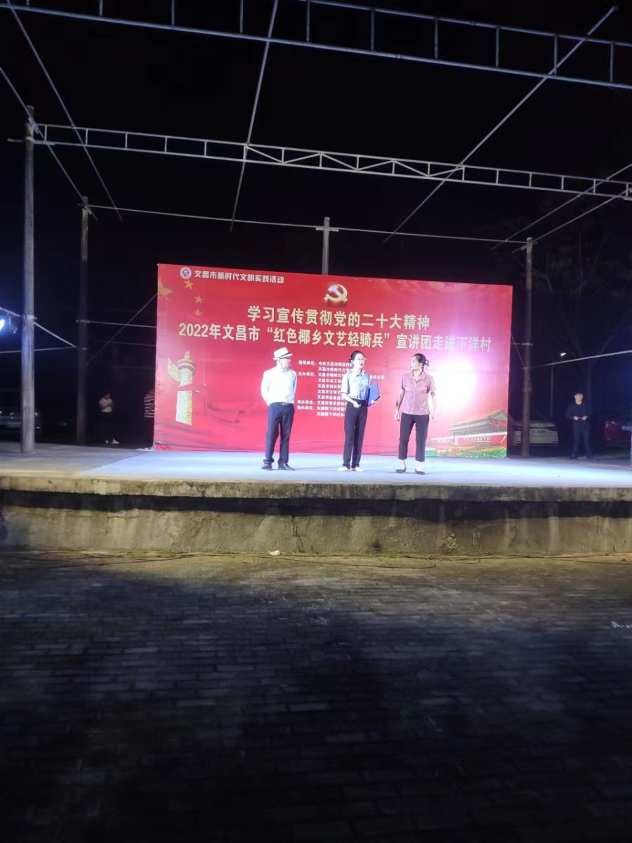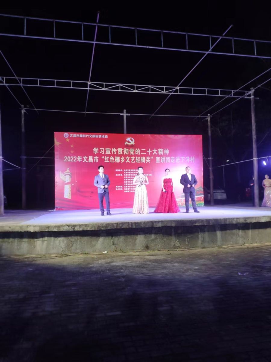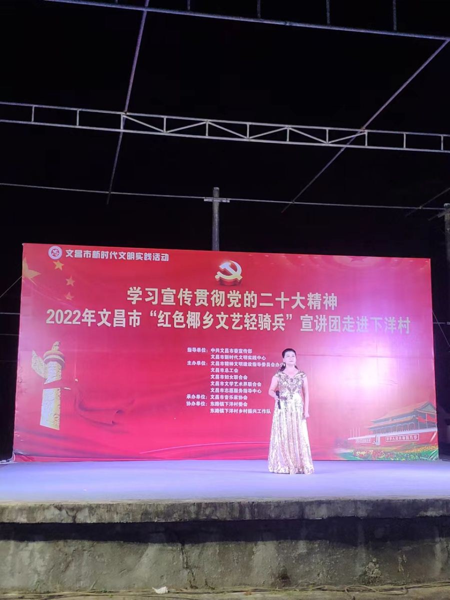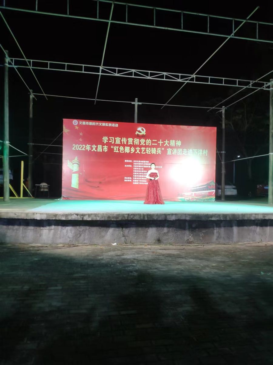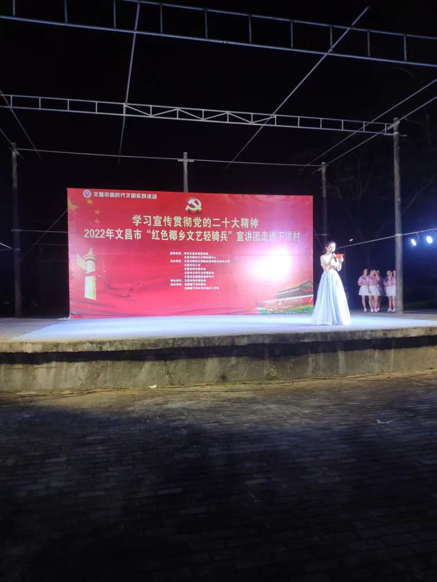 为进一步深入学习贯彻落实习近平新时代中国特色社会主义思想,发挥文艺的独特优势,激发和凝聚广大干部职工群众的干事创业热情,以更加饱满的豪情斗志投入到加快文昌国际航天城建设中来,在中共文昌市委宣传部指导下,文昌市总工会、文昌市妇联、文昌市文联决定,组织文艺宣讲队伍,围绕党的二十大精神学习宣传、乡村振兴、重点项目建设、创建全国文明城市、“扫黄打非”、关爱未成年人等全市重点工作,于2022年11月18日晚上8:00在文昌市东路镇下洋村委会开展2022年文昌市新时代文明实践系列活动。