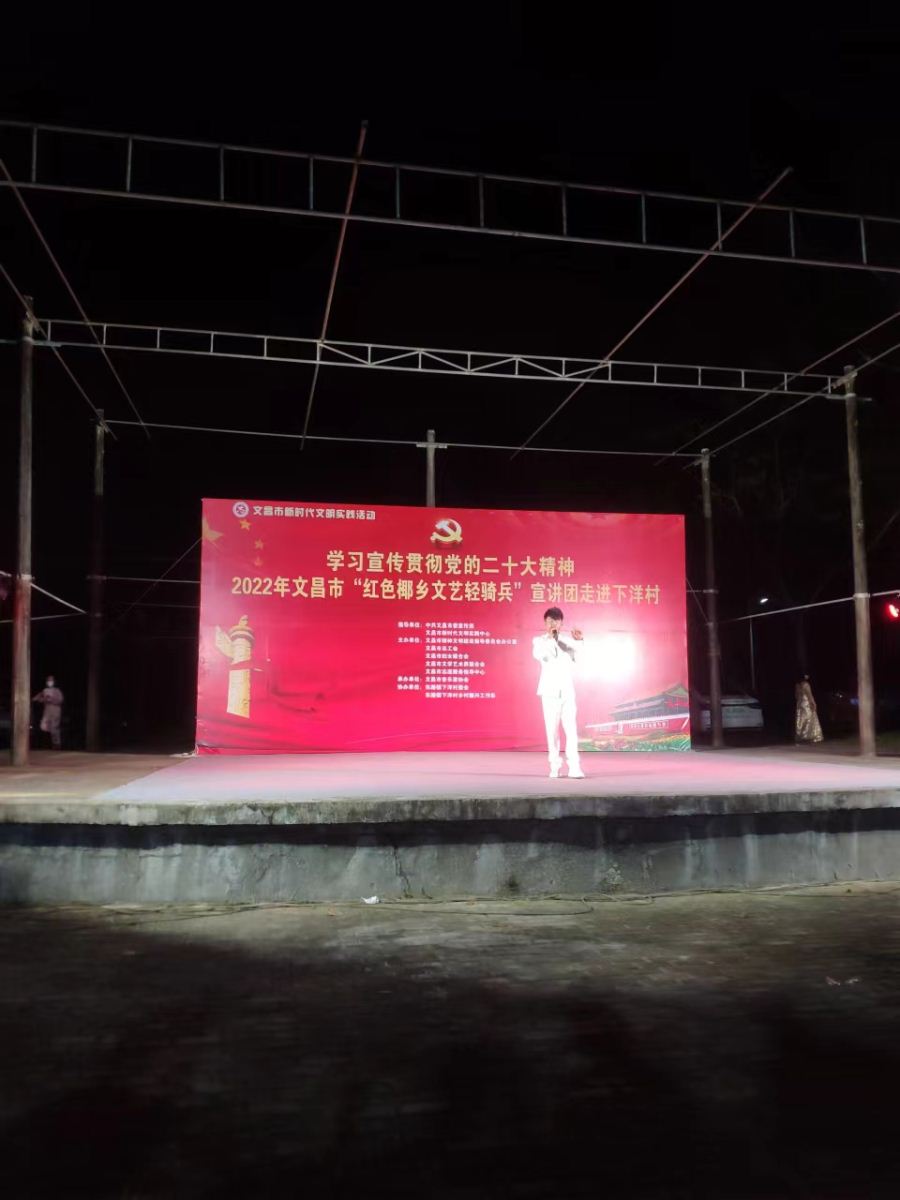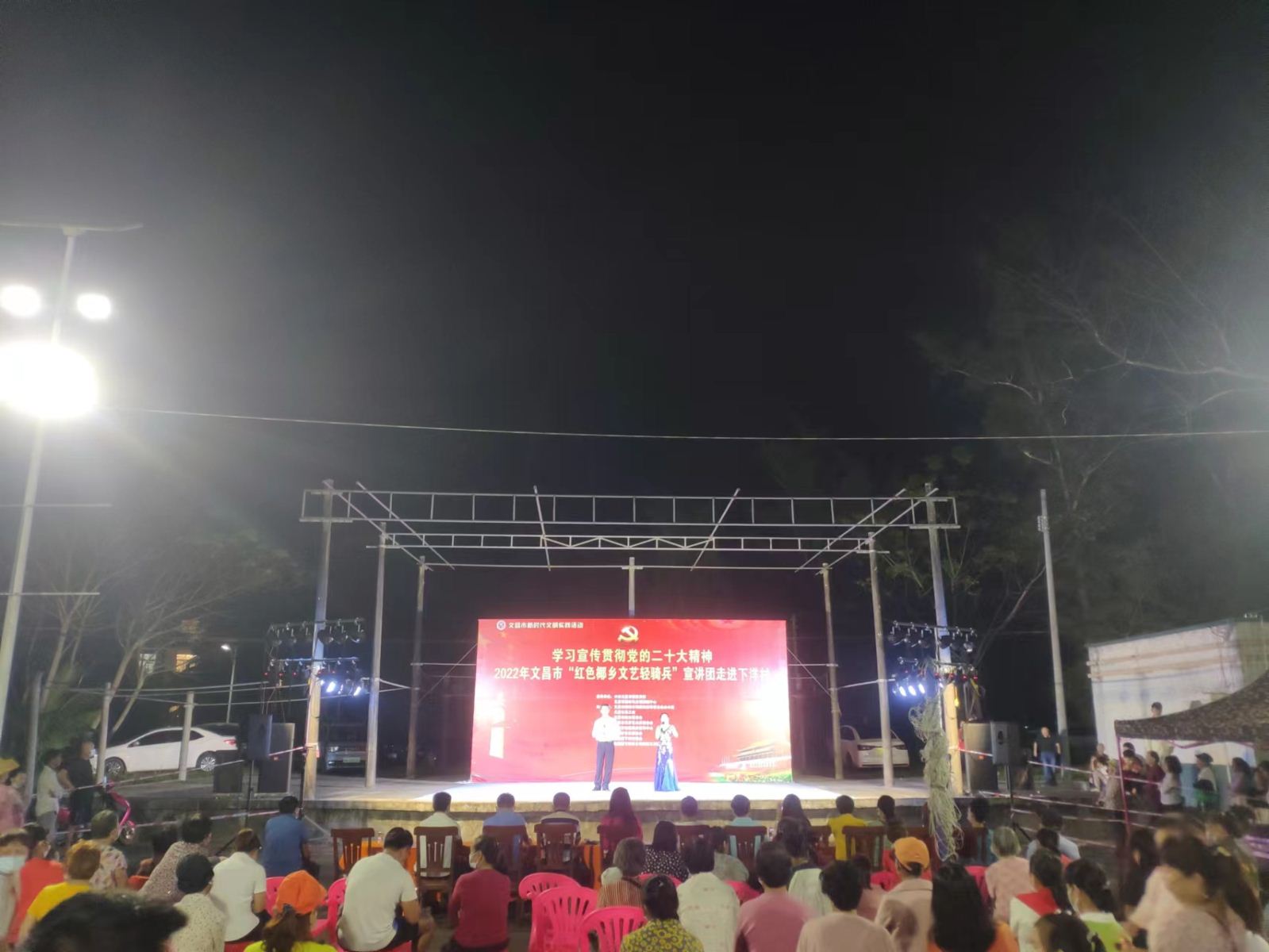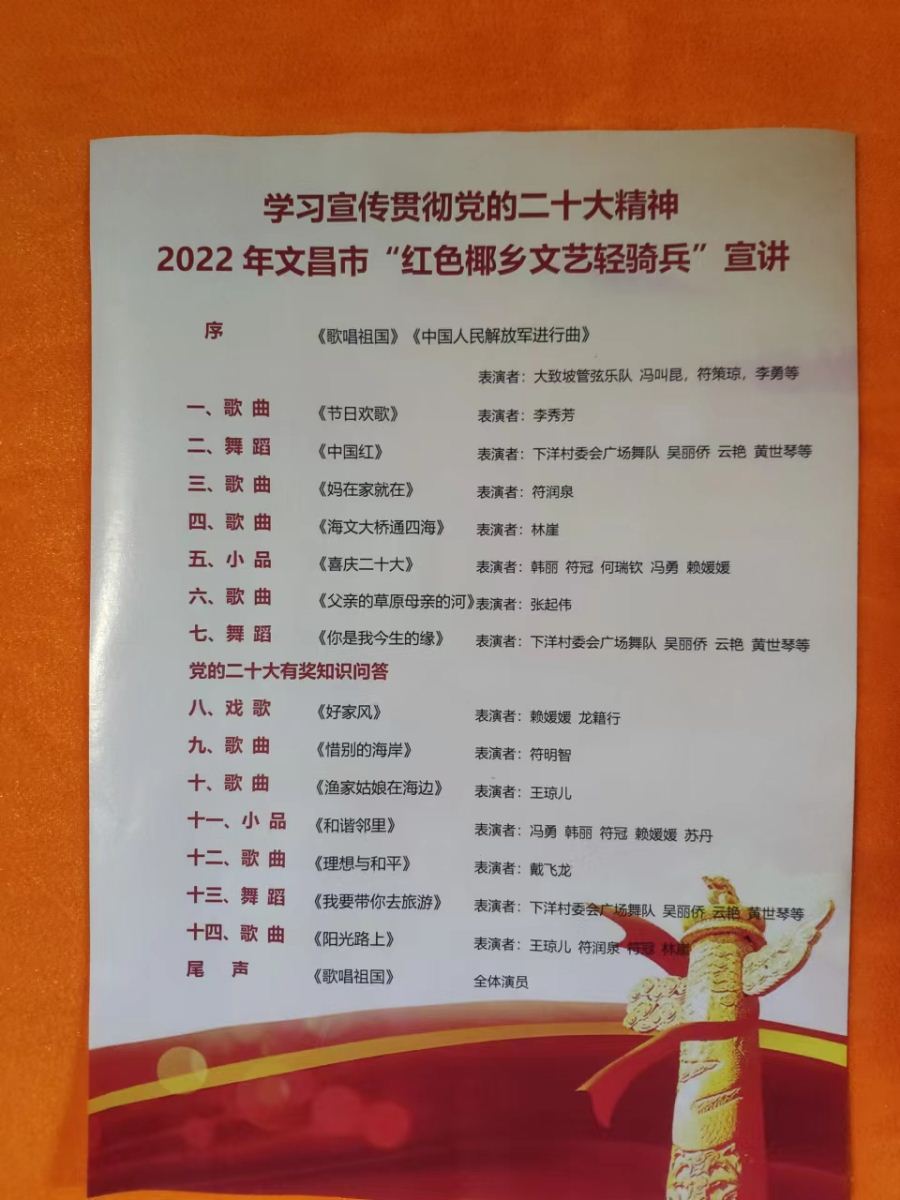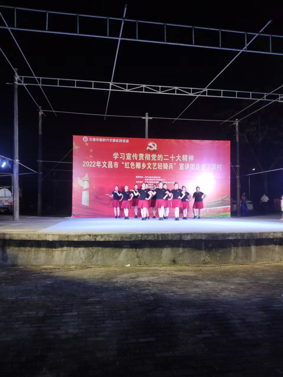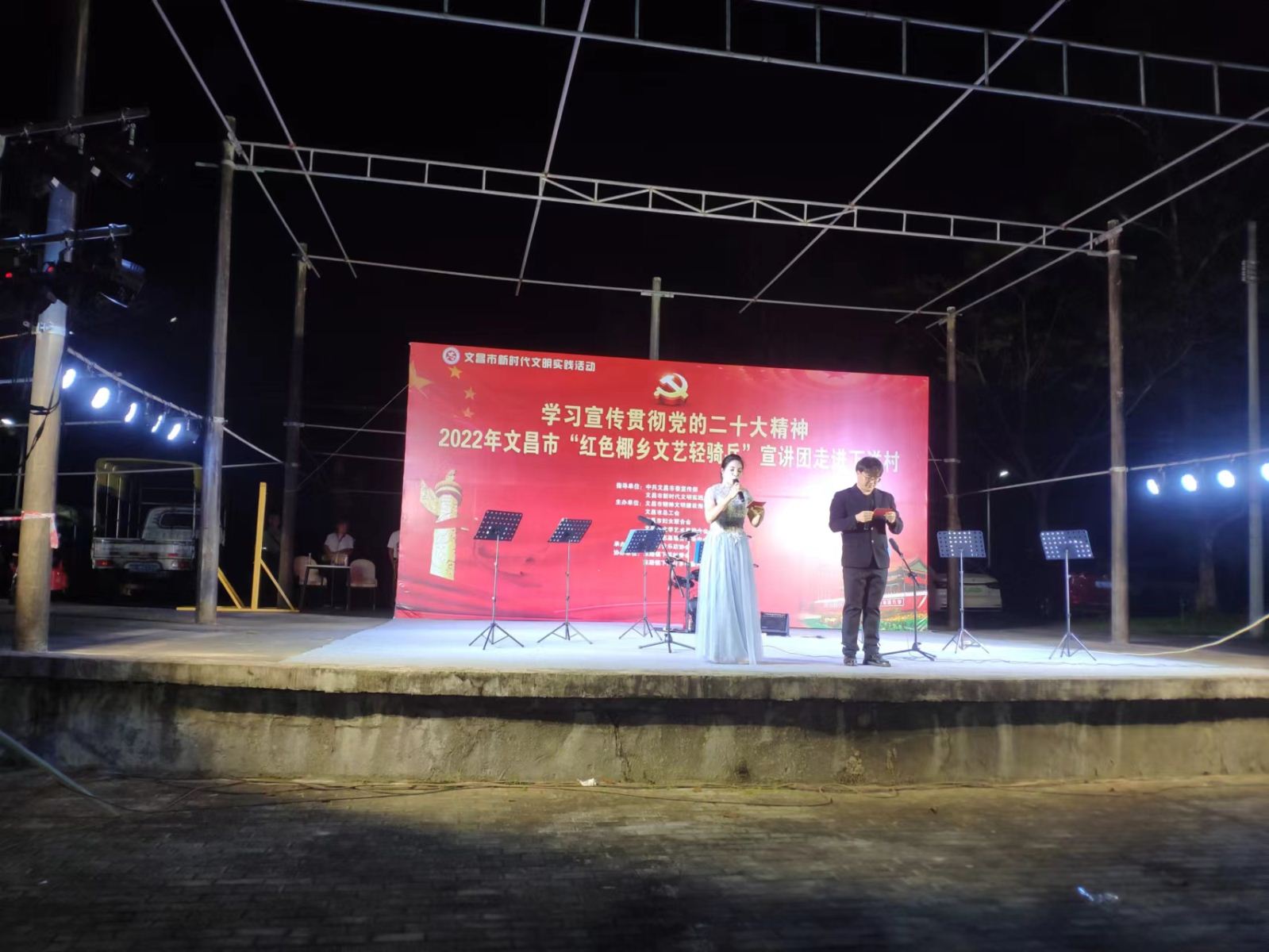 为进一步深入学习贯彻落实习近平新时代中国特色社会主义思想,发挥文艺的独特优势,激发和凝聚广大干部职工群众的干事创业热情,以更加饱满的豪情斗志投入到加快文昌国际航天城建设中来,在中共文昌市委宣传部指导下,文昌市总工会、文昌市妇联、文昌市文联决定,组织文艺宣讲队伍,围绕党的二十大精神学习宣传、乡村振兴、重点项目建设、创建全国文明城市、“扫黄打非”、关爱未成年人等全市重点工作,于2022年11月18日晚上8:00在文昌市东路镇下洋村委会开展2022年文昌市新时代文明实践系列活动。