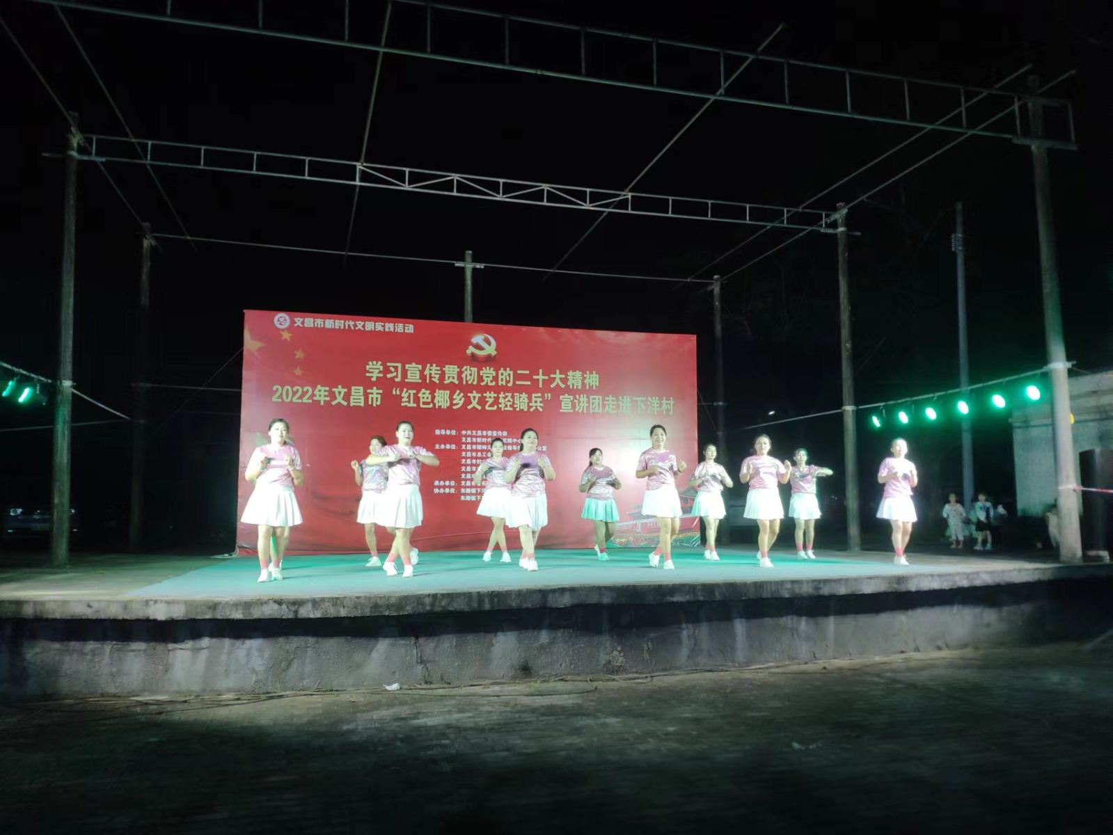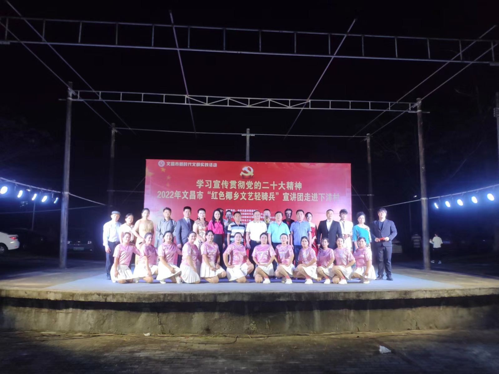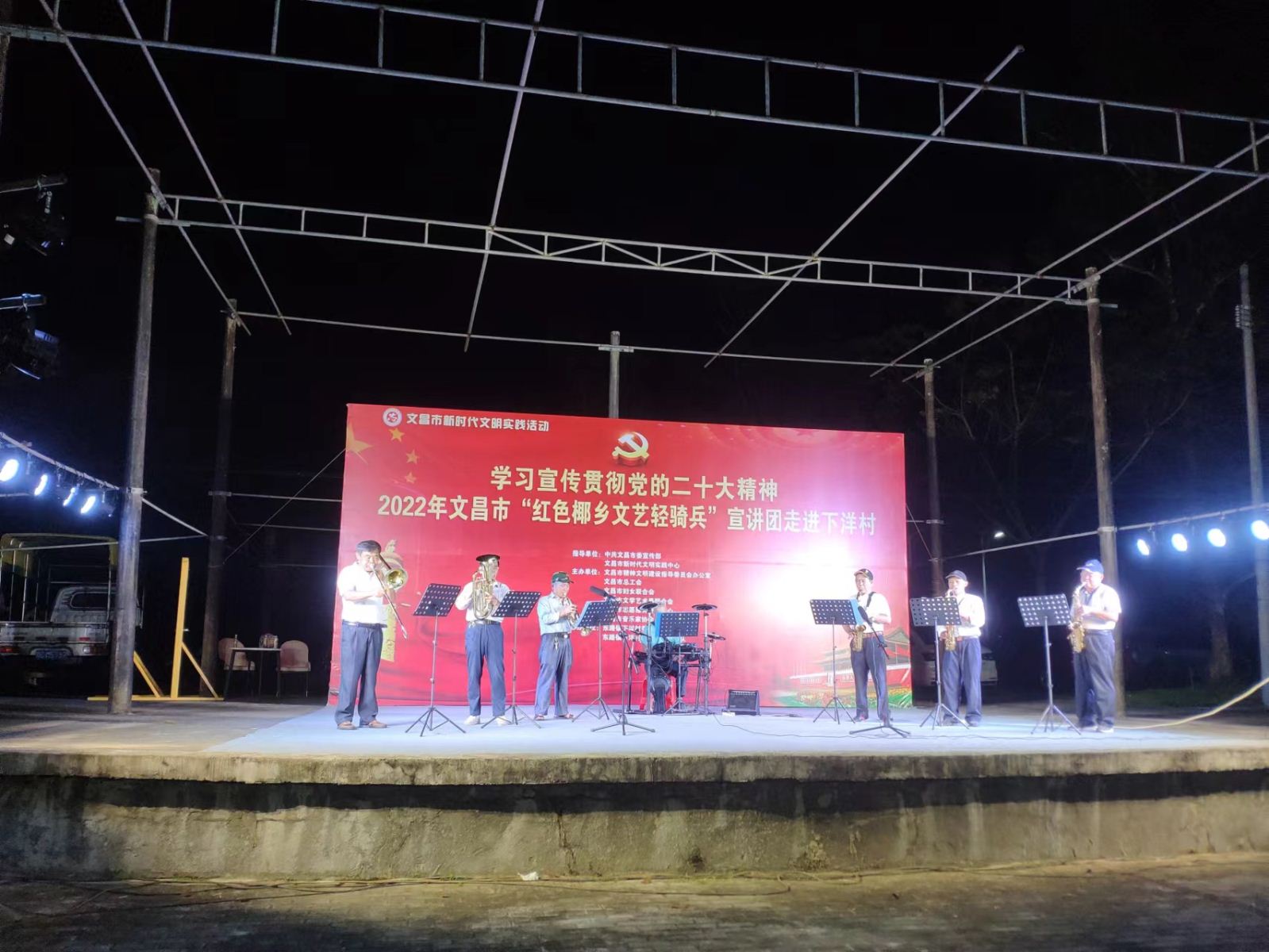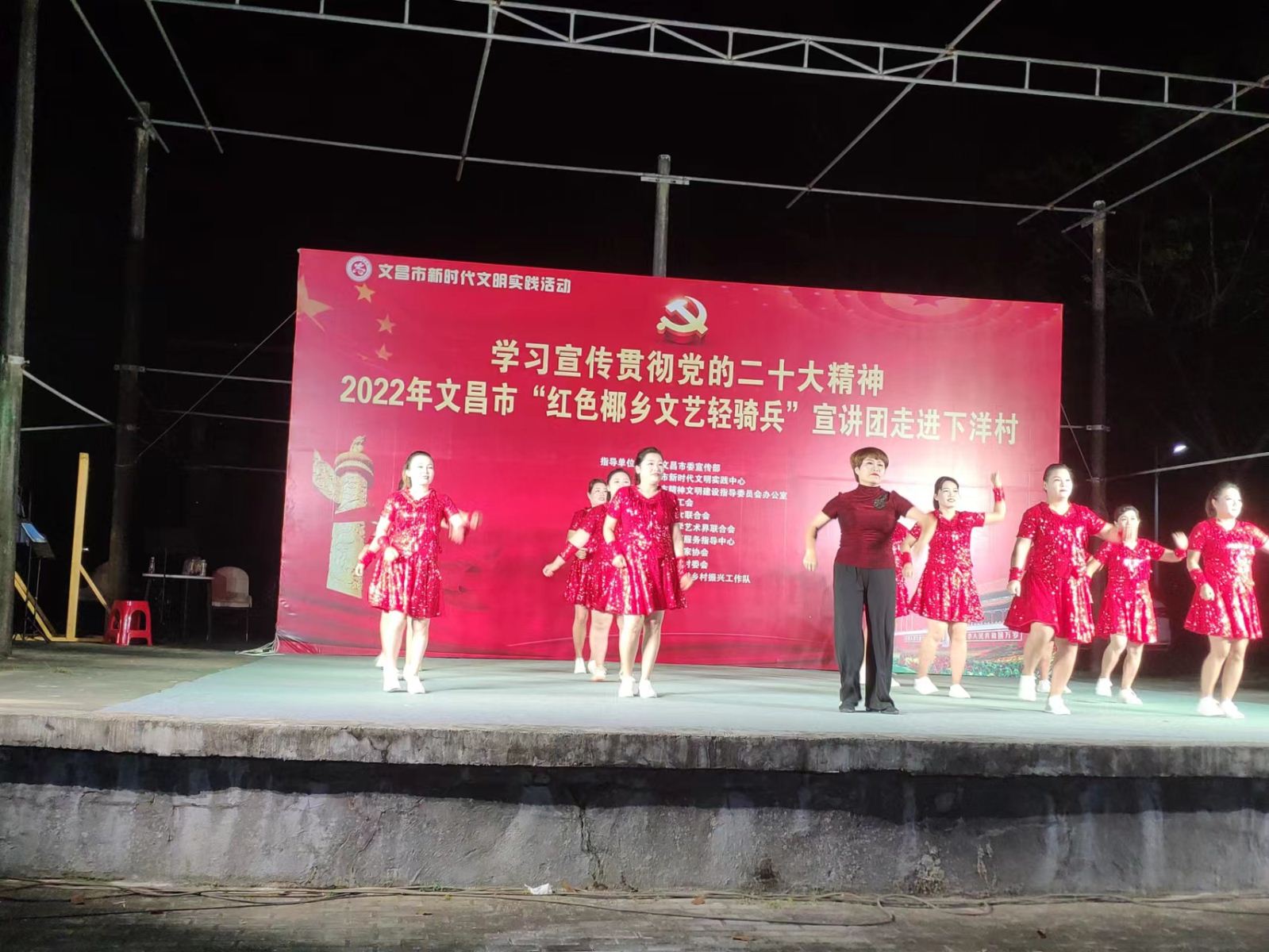 为进一步深入学习贯彻落实习近平新时代中国特色社会主义思想,发挥文艺的独特优势,激发和凝聚广大干部职工群众的干事创业热情,以更加饱满的豪情斗志投入到加快文昌国际航天城建设中来,在中共文昌市委宣传部指导下,文昌市总工会、文昌市妇联、文昌市文联决定,组织文艺宣讲队伍,围绕党的二十大精神学习宣传、乡村振兴、重点项目建设、创建全国文明城市、“扫黄打非”、关爱未成年人等全市重点工作,于2022年11月18日晚上8:00在文昌市东路镇下洋村委会开展2022年文昌市新时代文明实践系列活动。