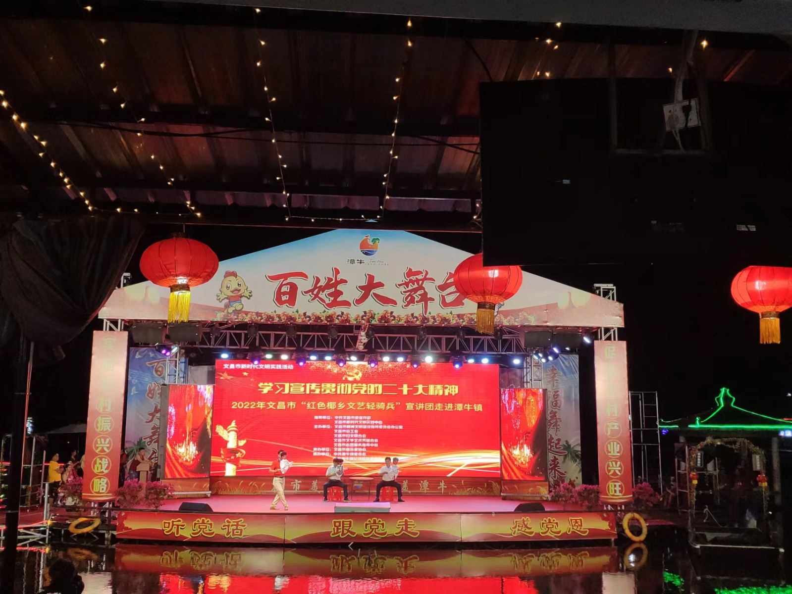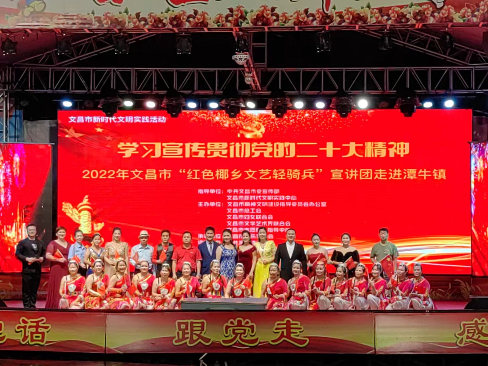为进一步深入学习贯彻落实习近平新时代中国特色社会主义思想,发挥文艺的独特优势,激发和凝聚广大干部职工群众的干事创业热情,以更加饱满的豪情斗志投入到加快文昌国际航天城建设中来,在中共文昌市委宣传部指导下,文昌市总工会、文昌市妇联、文昌市文联决定,组织文艺宣讲队伍,围绕党的二十大精神学习宣传、乡村振兴、重点项目建设、创建全国文明城市、“扫黄打非”、关爱未成年人等全市重点工作,于2022年11月24日晚上8:00在文昌市潭牛镇田野公园开展2022年文昌市新时代文明实践系列活动。