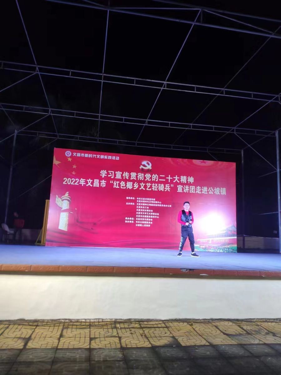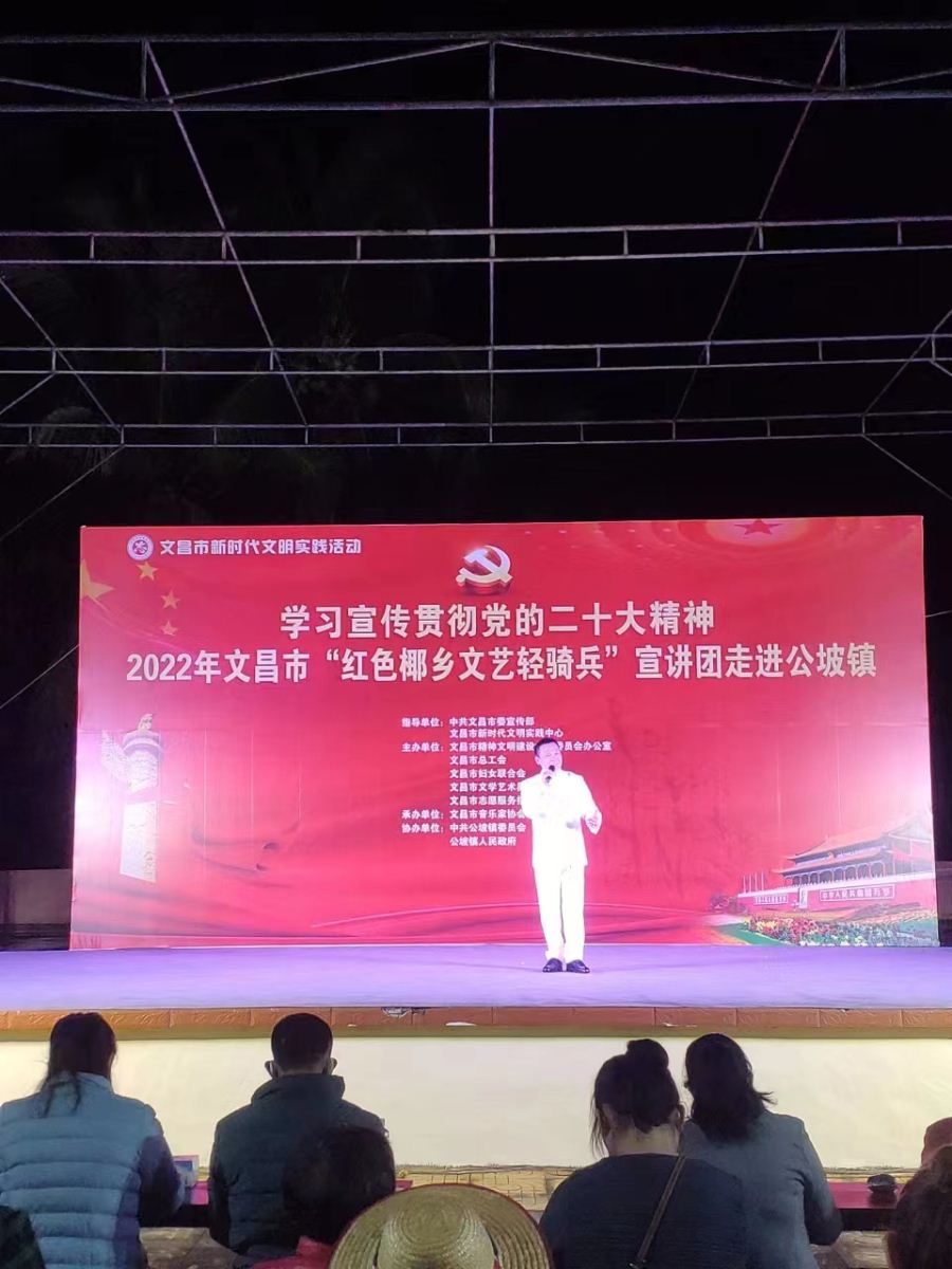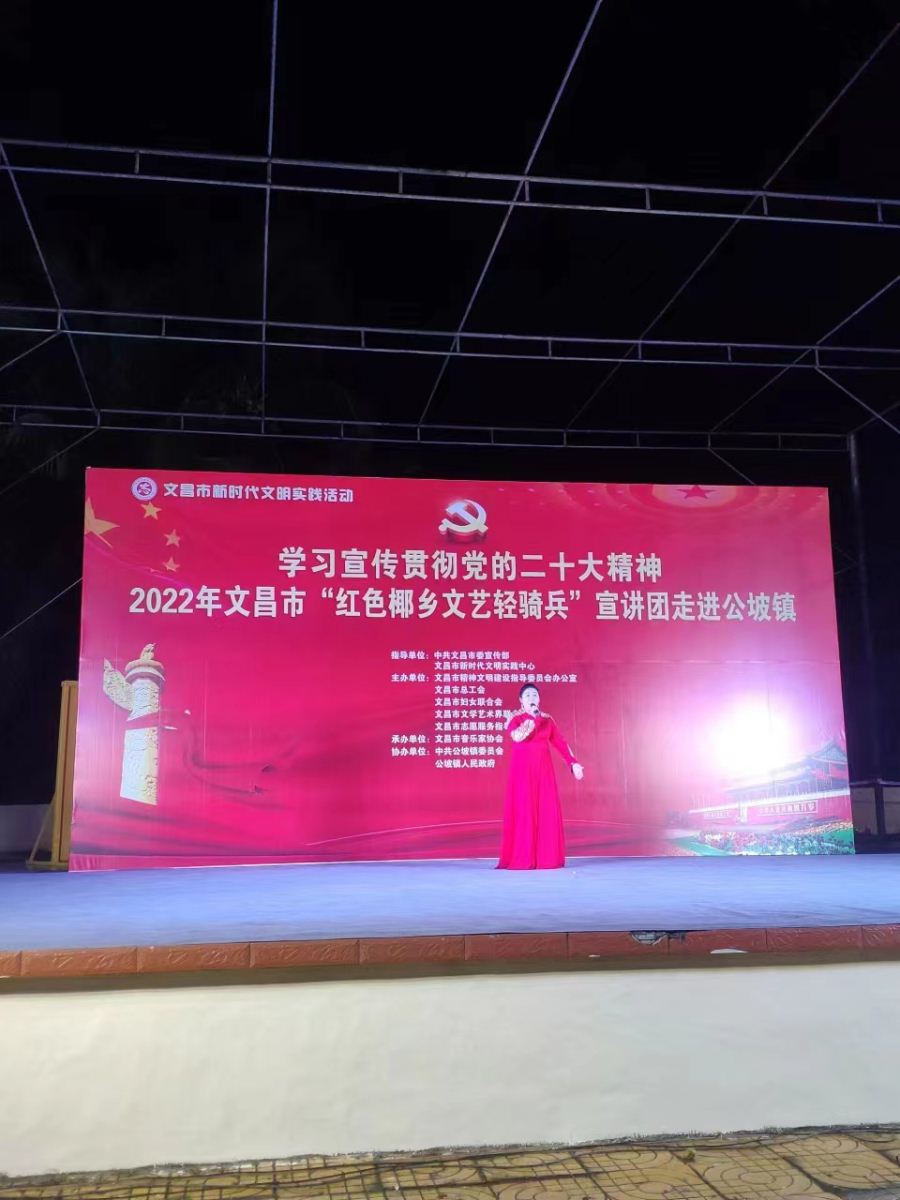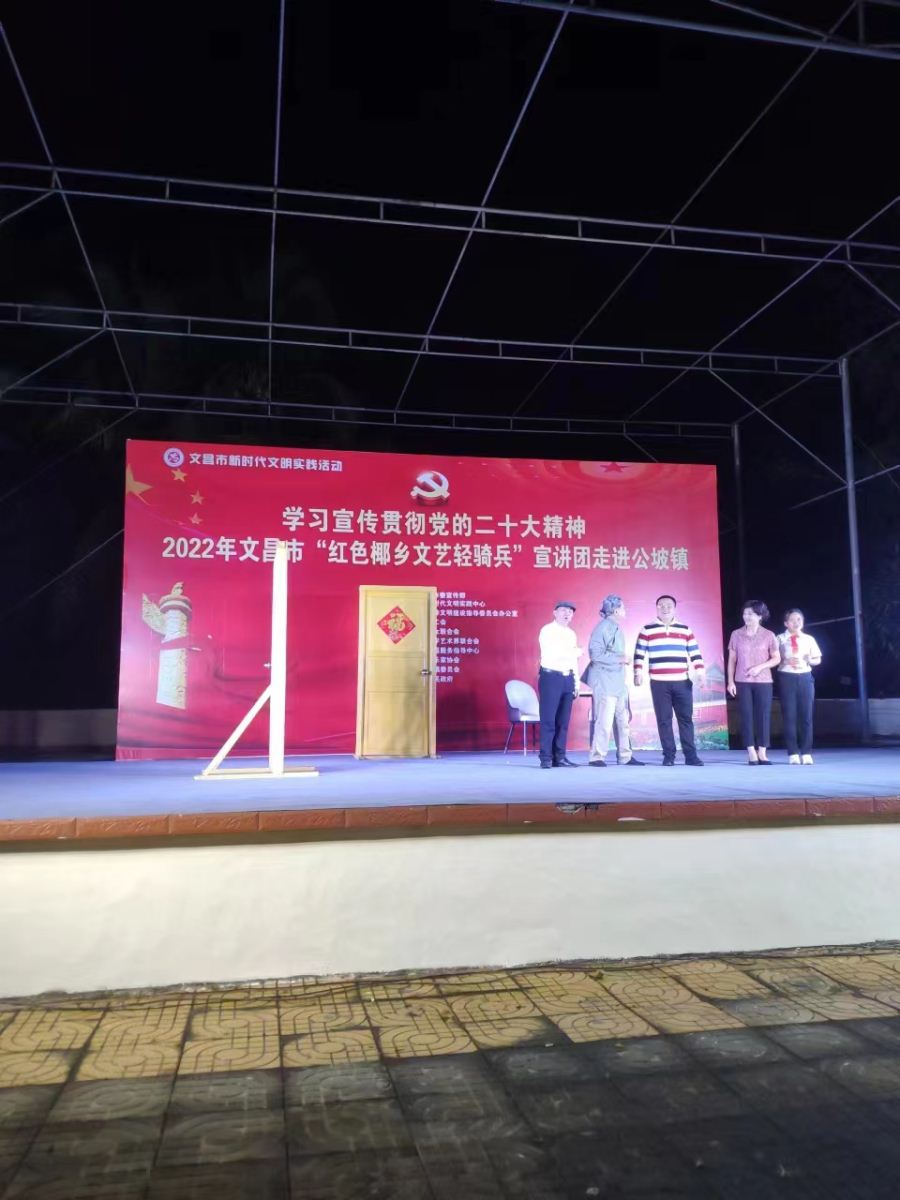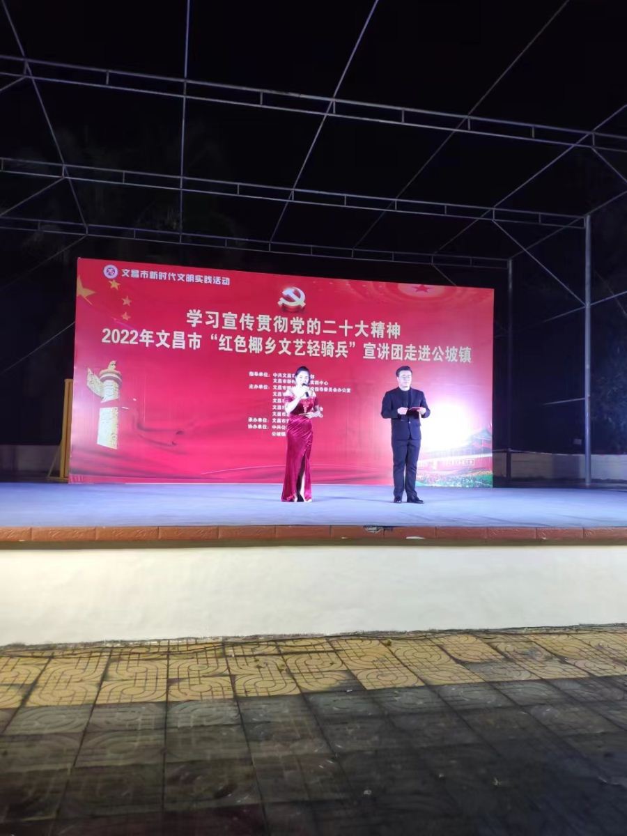 为进一步深入学习贯彻落实习近平新时代中国特色社会主义思想,发挥文艺的独特优势,激发和凝聚广大干部职工群众的干事创业热情,以更加饱满的豪情斗志投入到加快文昌国际航天城建设中来,在中共文昌市委宣传部指导下,文昌市总工会、文昌市妇联、文昌市文联决定,组织文艺宣讲队伍,围绕党的二十大精神学习宣传、乡村振兴、重点项目建设、创建全国文明城市、“扫黄打非”、关爱未成年人等全市重点工作,于2022年12月15日晚上8:00在文昌市公坡镇开展2022年文昌市新时代文明实践系列活动。