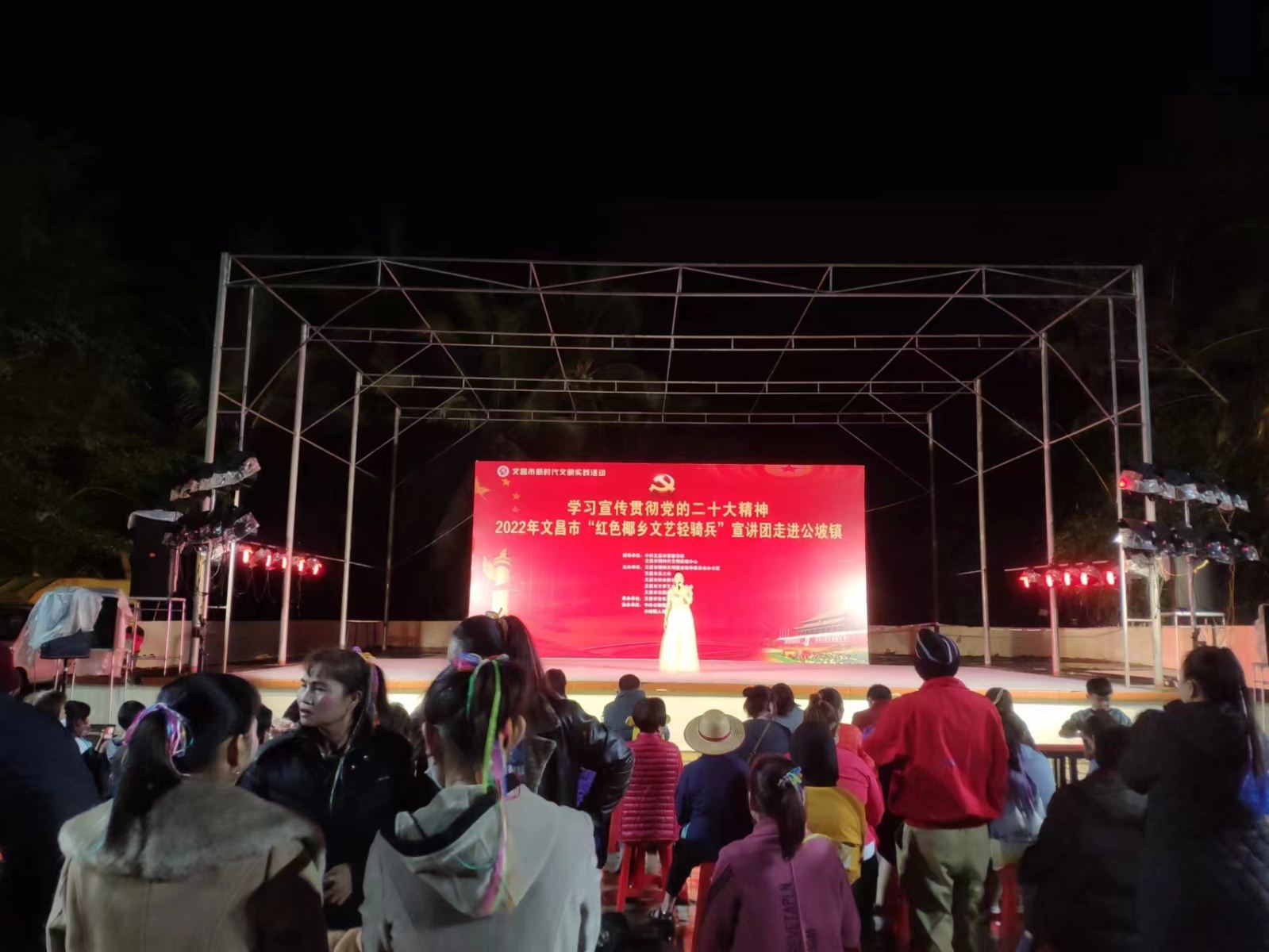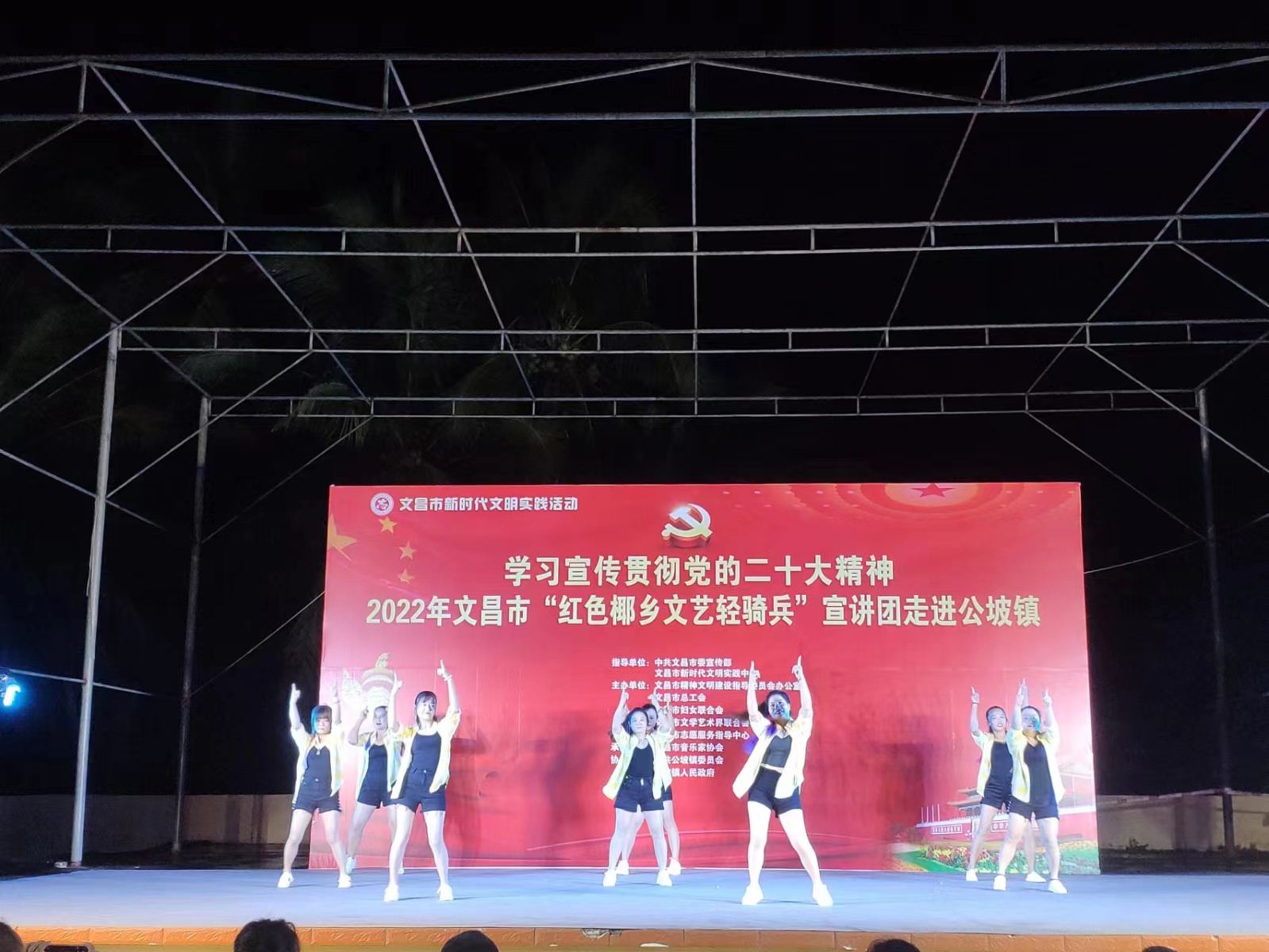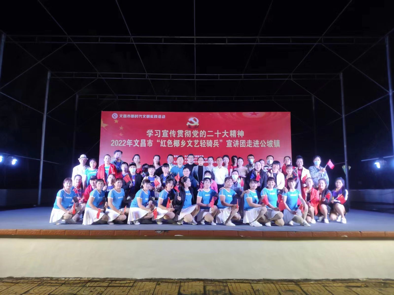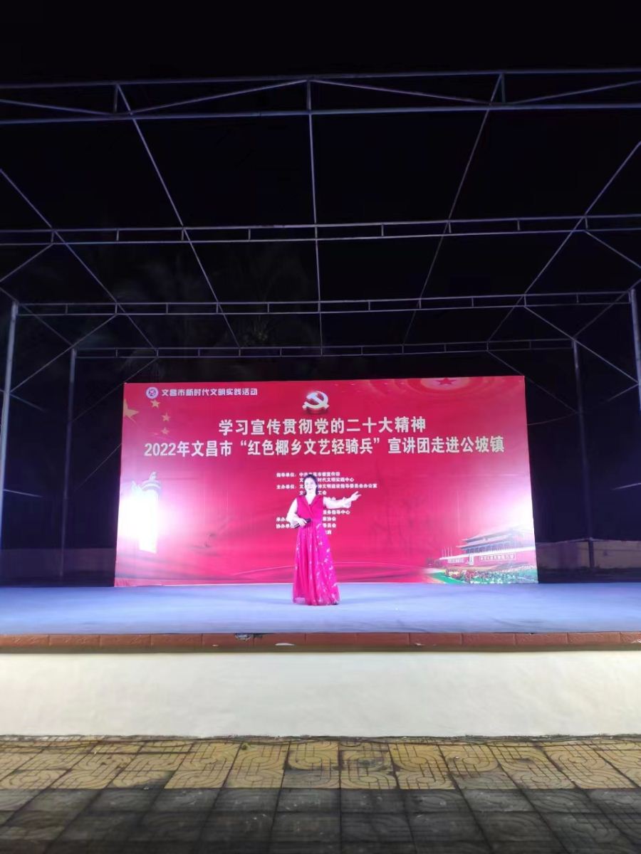 为进一步深入学习贯彻落实习近平新时代中国特色社会主义思想,发挥文艺的独特优势,激发和凝聚广大干部职工群众的干事创业热情,以更加饱满的豪情斗志投入到加快文昌国际航天城建设中来,在中共文昌市委宣传部指导下,文昌市总工会、文昌市妇联、文昌市文联决定,组织文艺宣讲队伍,围绕党的二十大精神学习宣传、乡村振兴、重点项目建设、创建全国文明城市、“扫黄打非”、关爱未成年人等全市重点工作,于2022年12月15日晚上8:00在文昌市公坡镇开展2022年文昌市新时代文明实践系列活动。