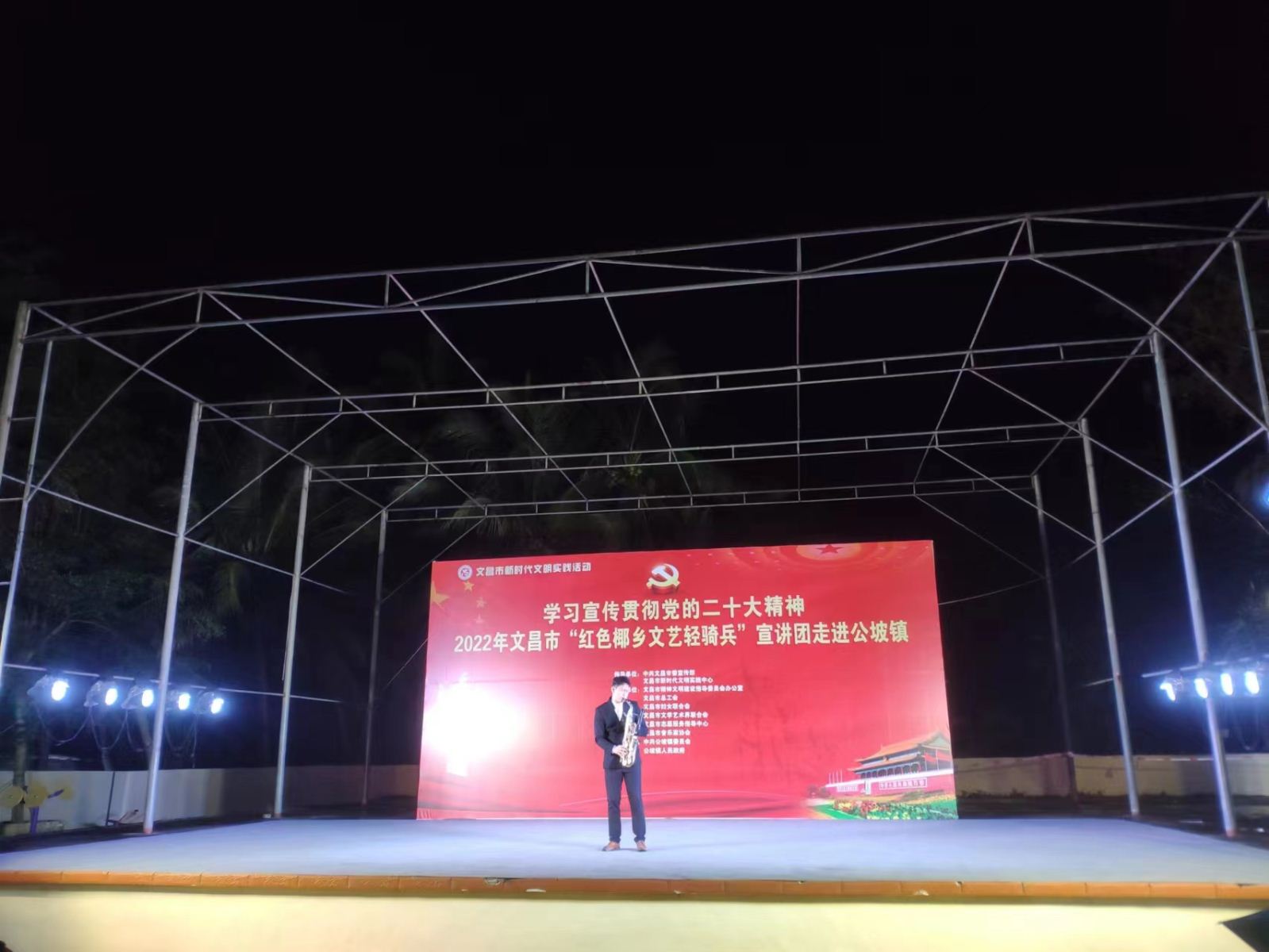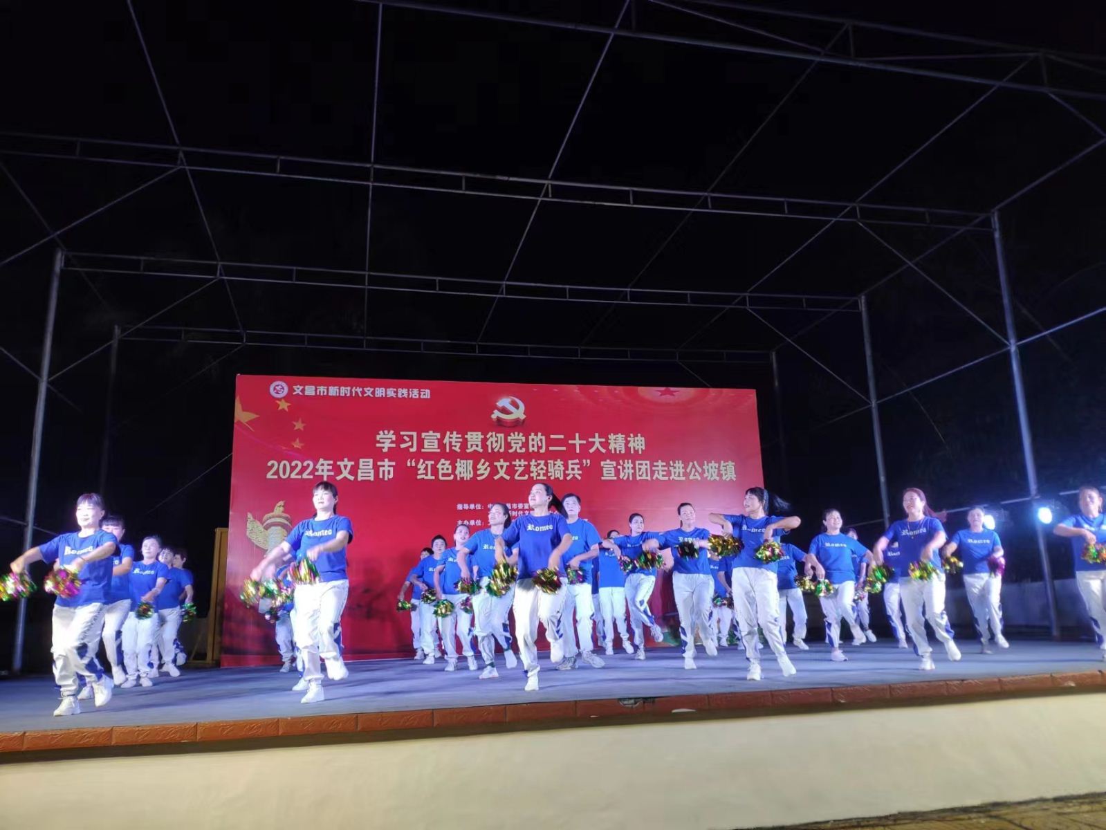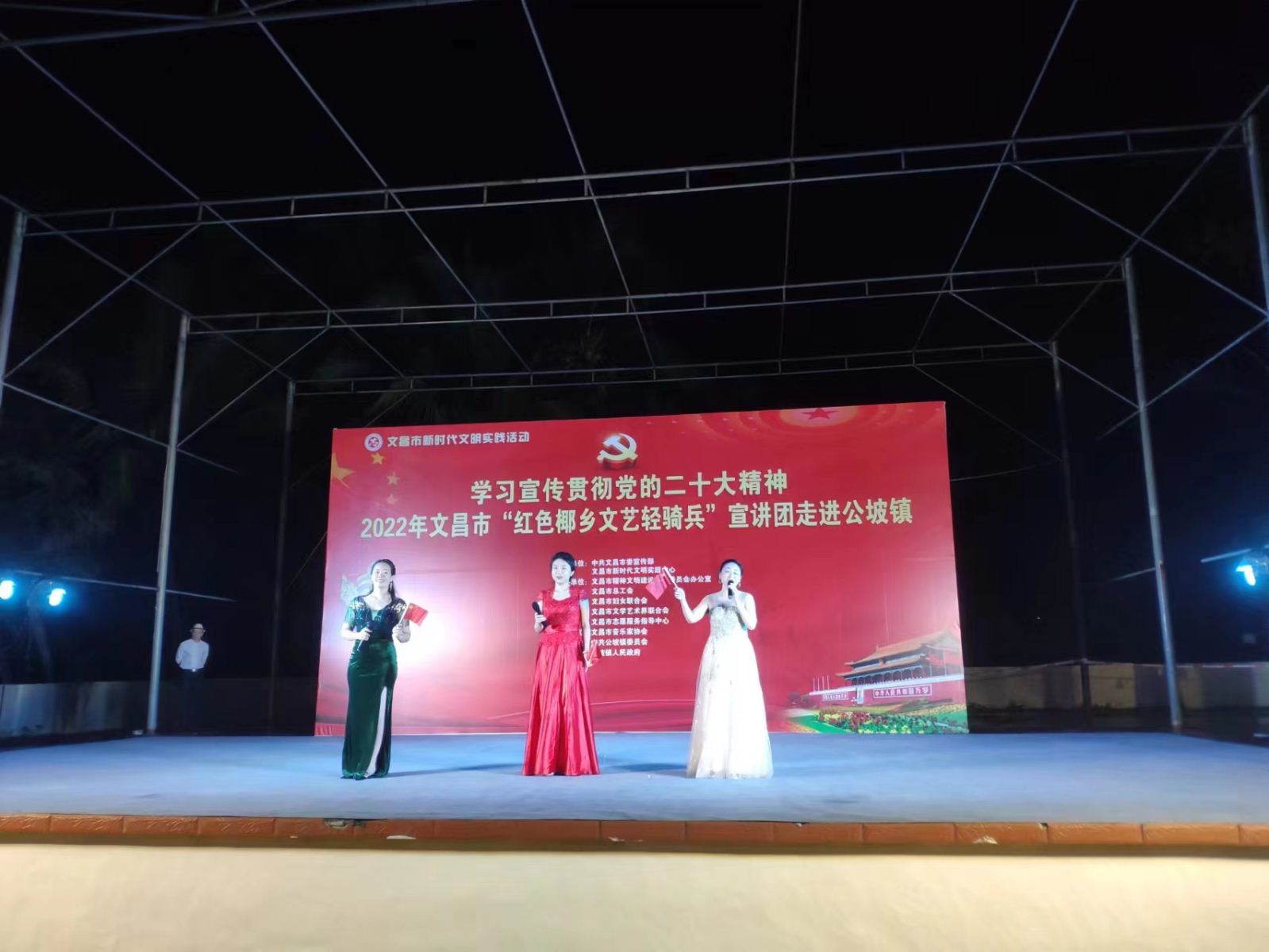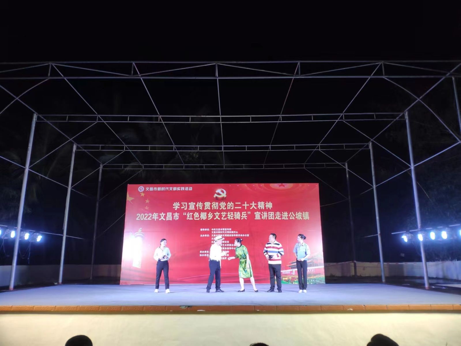 为进一步深入学习贯彻落实习近平新时代中国特色社会主义思想,发挥文艺的独特优势,激发和凝聚广大干部职工群众的干事创业热情,以更加饱满的豪情斗志投入到加快文昌国际航天城建设中来,在中共文昌市委宣传部指导下,文昌市总工会、文昌市妇联、文昌市文联决定,组织文艺宣讲队伍,围绕党的二十大精神学习宣传、乡村振兴、重点项目建设、创建全国文明城市、“扫黄打非”、关爱未成年人等全市重点工作,于2022年12月15日晚上8:00在文昌市公坡镇开展2022年文昌市新时代文明实践系列活动。