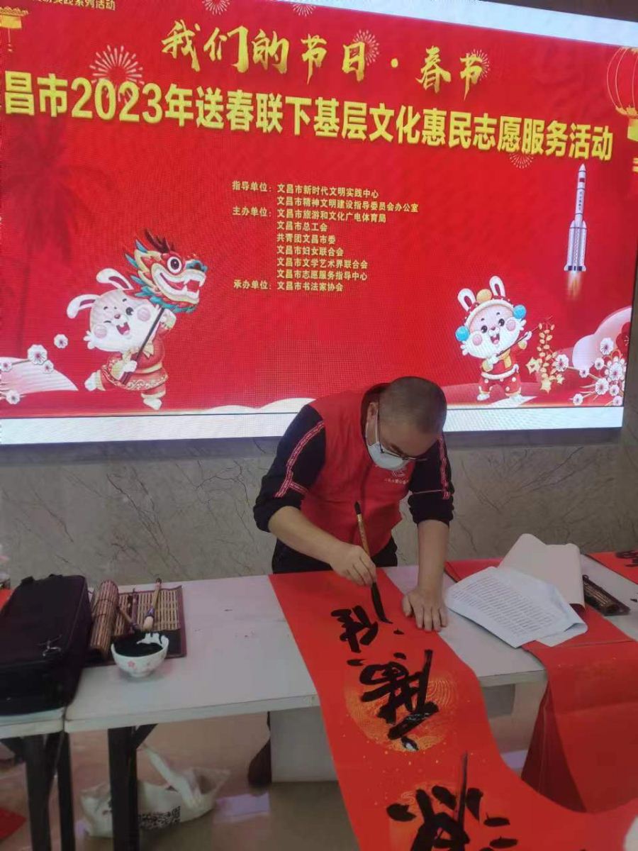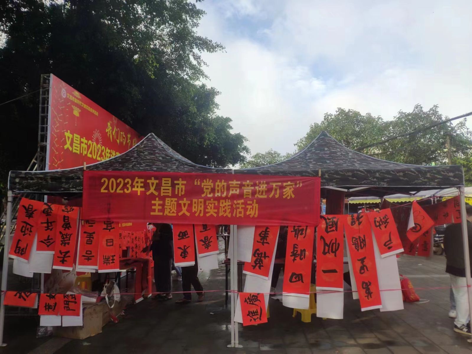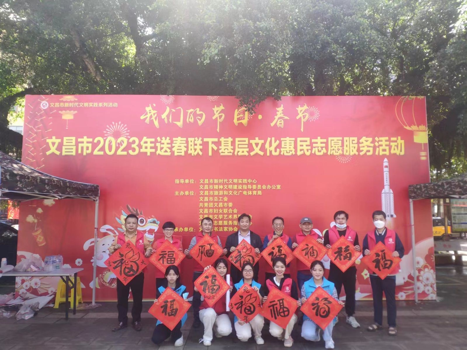 为持续做好文昌市创建全国文明城市工作,营造欢乐祥和的春节氛围,推动党的二十大精神深入人心、落地生根,引导群众增强感党恩、听党话、跟党走的信心和决心。文昌市精神文明建设指导委员会决定在2023年春节前夕举办“我们的节日‧春节”——文昌市2023年送春联下基层文化惠民志愿服务活动。具体如下: