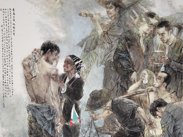 鹦哥岭热带雨林自然保护区,五万公顷土地几乎无人涉足,2006年来自全国12个省市的大学毕业生聚集到这里,为帮村民致富,数年间他们的足迹遍及了103个村庄的每个角落,并发现记录到动植物2千余种,他们舍弃繁华,甘于贫苦,只为坚守心中的梦想。 《青春守护.魂铸鹦哥》立意精巧,构图严谨,画风朴拙、厚重、铺展开来;雨林守护神的形象,跃然纸上,作品秉持高尚的道德情操,坚持高水准的学术理念,以推进人文生态保护意识,创造和谐美好家园,弘扬社会主流价值观为已任,雨水、汗水、椰子水,情景交融出守护与奉献的大爱颂歌。