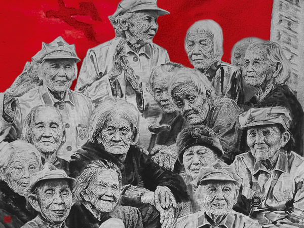 当我为这几位红色娘子军阿婆们画像时,更像为新中国妇女解放运动建造一座人性的丰碑。幸存的红色娘子军们青春早已远去,矫健的身姿已然佝偻,岁月的沧桑也爬满脸庞;但曾经的青春无悔,让她们的眼神或冷峻、或慈祥、或豁达、或恬静、或平和,或深邃,于集体的静穆中透着刚毅与坚定,诠释着艰苦卓绝的战争年代曾经无比美丽的青春年华,正如一抹艳丽的血色,染红了她们的青春,也染红了你我的记忆!