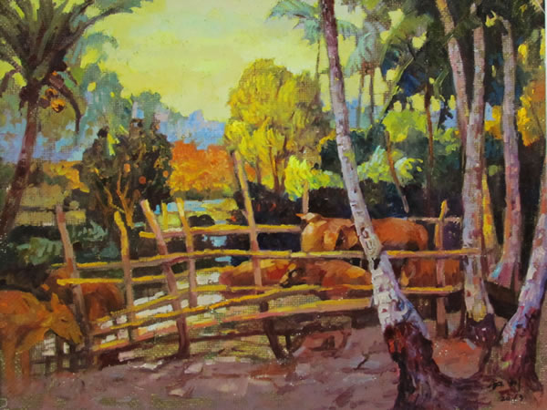 《黎寨》(油画)是我创作的反映海南黎苗风情系列作品中的一幅主要作品。创意来源于我多年工作、生活在黎苖族山区,崇敬黎苗族人民的风俗风情以及独特的风貌,描绘的是黎寨傍晚的场景,夕阳、椰树、船形屋、牛群勾勒出一幅人与自然的风景。