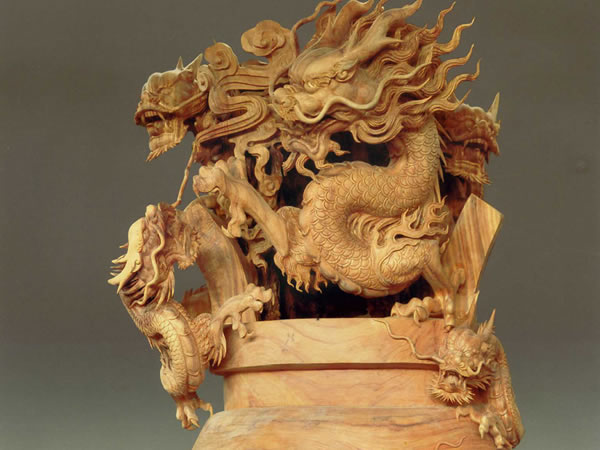 作品由千年老樟木雕刻而成,整体造型雄伟气势,九条龙大小不一,以鼎为中心,围绕鼎上大小盘旋长势有力,错落有序,体现出:“九龙呈祥,九州大同”。鼎是王者与权利的象征,九龙鼎加以改造创新,赋予了“九九归一,中华大同”的时代内涵,三个粗壮雄健的鼎足由狮头狮足构成,涵江水永固之意。