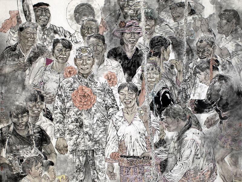 中国画《送兵图》以反应黎族同胞以自己独特的方式载歌载舞欢送青年入伍为背景,叙述和平时期不忘居安思危的爱国情怀,描绘好儿郎志许军营的豪迈情怀,折射出边远山村平常人家的家国情怀。