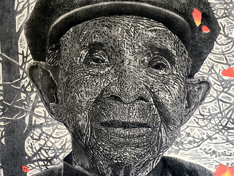 该作品展现的是104岁红色娘子军老战士王运梅皱纹如网,镌满岁月沧桑的形象。作品采用水印木刻版画,以大幅人物特写形式刻画。通过典型画面让人们记住她们,记住琼岛上那段红色的传奇,记住那万泉河水哺育出的椰一样伟岸的女子,缅怀她们,继承和发扬她们的革命精神。 红色娘子军,一个多么响亮的名号,震惊世界影响几代中国人。她诞生于上个世纪三十年代,是中国妇女解放运动的一面鲜艳旗帜,这支由琼海籍妇女为主的100多人的中国最早的妇女革命武装,威震琼崖闻名中外,奏响了中国革命和妇女解放运动中最为光彩的一段乐章。毛泽东同志曾称“红色娘子军是革命的典范。” 红色娘子军精神是中华民族一笔宝贵的精神财富,让我们继续把它发扬光大,让红色精神代代相传,永不熄灭。 英雄花——追念永存,红色娘子军精神万世传扬。