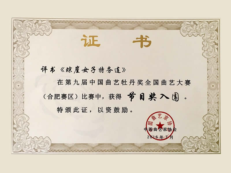 评书《琼崖女子特务连》曾经荣获第九届中国曲艺牡丹奖节目入围奖,海南省第二届曲艺大赛曲艺类一等奖。