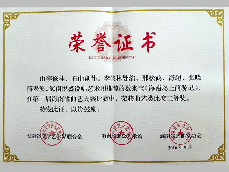该作品于2017年代表海南省参加首届中国东部曲艺展演,荣获海南省第二届曲艺大赛曲艺类二等奖。