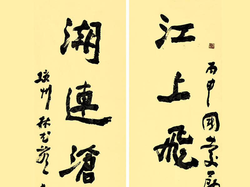 江上飞云来北固,潮连沧海欲东遊.古人云“帖与碑,合之两美,离之两伤”。此作"江上飞云来北固,潮连沧海欲东遊”碑帖兼融,形式为榜书对联,更能体现魏碑雄强的特点,又兼有帖的逸韵,整体观之,大气、浑厚、静雅。