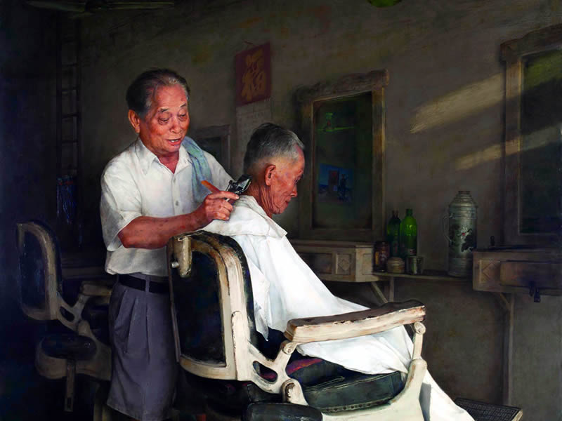 油画作品《祥和的日子》,取材于海南岛文昌市抱罗小镇的老字号理发店。面对一张早年抓拍的模糊照片,一种莫名的怀旧情感,驱使我对老照片进行源于生活又高于生活的艺术创作!希望这幅作品,能从普通人司空见惯的日常生活情景,上升到技艺与思想相融合的艺术高度。通过两位老人慈祥的神态和平静的心境,展现了人们对祥和日子的知足与珍惜,赞美了普通海南人的善良和知足乐观的精神面貌。在绘画技法上,我仍延用最擅长的新古典主义表现手法,采用间接画法,层层罩染叠擦,厚薄相间,反复刻画,削弱色彩,强化黑白灰的对比,从而增强了画面的视觉冲击力与艺术感染力。