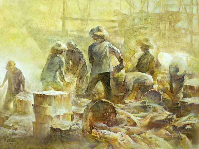 南海浩瀚无疆,自古就是中国的版图。海南渔民世世代代勤劳耕海,餐风历浪,辛苦劳作,在祖宗海里讨生活。岁月沉淀成他们古铜的肤色,风霜塑造了他们伟岸的身躯。他们憨厚质朴,不畏风雨,闯荡深海,维护着一家人的生活尊严,也维护着祖国的海洋权益。有感于这个群体的人文情怀与生活背景,促成水彩画《南海渔讯》的构思形成。作品取材于琼海谭门渔港开海后渔民劳动生活的场景。作品以三角形构图为主轴,突出画面平稳、上升感。色调以暖金的光感烘托丰收的喜悦氛围与落日溶金的美感。画面将海作了省略,而以渔船喻示了海的深远,做到了此时无声胜有声。画作的前面罗列了丰收的渔获,主体人物在中间一字排开,左边人物头部向外,拓宽画面的外延空间。人物表情做了筒化,人物的高低聚散,人群动势如起伏有序的音符,而中间人物是跳跃的高音符,演译铿锵的渔歌,渲染丰收的渔讯。画面处理采用聚光式的方法,主次分明。对主体部位进行刻画,而次要之处相应放松,追求画面的唯美性与宛约感。