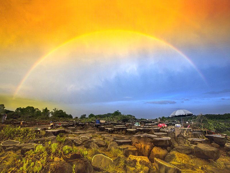 千年古盐田位于海南洋浦半岛盐田村的千年古盐田,距今已有1200年历史,盐工们根据海南岛高温烈日的特点,改变过去“煮海”为盐的方法,用经过太阳晒干的海滩泥沙浇上海水过滤,制成含高盐分的卤水,再将卤水倒在石槽内,经过暴晒制作成盐巴。目前这是最古老的制盐工艺,已列入到国家级非物质文化遗产名录。 历史悠久的千年古盐田,无数次激起我想创作的理念。我多次来到古盐田采风,真是功夫不负有心人,一次我终于拍到了古盐田壮观画面,当时古盐田下起倾盆大雨,雨过天晴,千年古盐田的上空挂着七色彩虹,不断升腾的彩色气浪,使千年古盐田气势磅礴、美丽壮观。