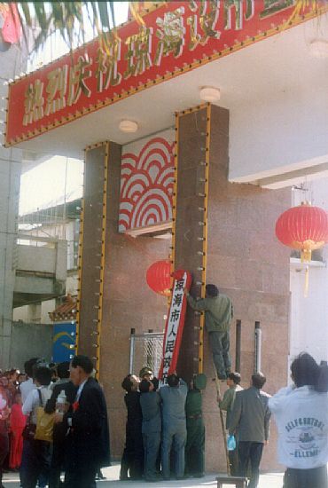 1993年2月6日,嘉积镇著名的红色娘子军雕像前鲜花盛放,礼炮齐鸣,琼海撤县设市庆典大会暨18项工程剪彩奠基仪式在这里隆重举行。国家民政部有关领导,海南省委正副书记,琼海市四套班子领导,各党政机关主要负责人,还有从各乡镇赶来的普通百姓齐聚一堂,共同欢庆这一历史性的时刻。出席庆典大会的有国家民政部区划地名司司长张文范,海南省委书记、省长阮崇武,省委副书记汪啸风等,大会收到中共中央政治局委员、国务院副总理田纪云,国务委员陈俊生,全国政协原副主席杨成武等中央领导同志发来的亲笔题词祝贺。在庆典大会上,市委书记、市长韩至中激动地说:“琼海撤县设市,标志着琼海进入新的旅程碑。在改革开放中,琼海人民要把握撤县设市的机遇,让别人发财,求自己发展。”当天上午,市委、市政府第一届领导班子成员护送牌匾到市委、市政府办公地点举行挂牌仪式。牌匾由专车护送,从红色娘子军雕像出发。一路上,欢声如雷,锣鼓阵阵,鞭炮声声,处处洋溢着欢乐与激情。