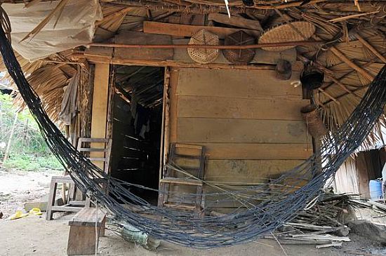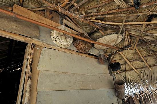 茅草屋内虽为泥地,但地面却十分坚硬平整。靠墙边上设三石灶,一口黑锅架在上面,火塘火势很旺。据主人介绍,这样烧火做饭不但能使屋内干燥,而且灶烟上熏可避虫蛀。