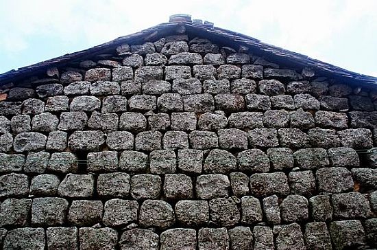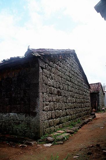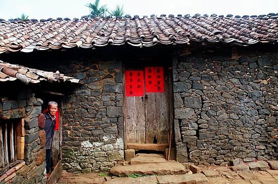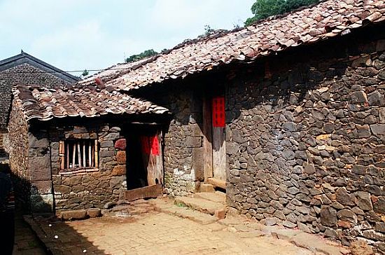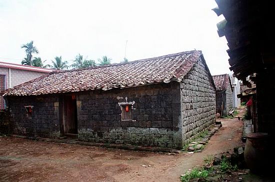 在琼海大路镇,随处可见黑褐色坚硬的玄武岩,那是一种由火山喷发出的岩浆凝固而成的致密状或泡沫状结构的岩石。在古代,当地人往往就地撬岩凿石,垒墙造屋。一切需要坚固、防潮、防虫的地方,如台阶、廊柱、墙体等,都使用了石块,只有屋顶才铺盖烧制的瓦片。这种古朴低矮的石头屋经受百余年的风吹雨打,至今依然坚实如故,在琼海民居中独树一帜。