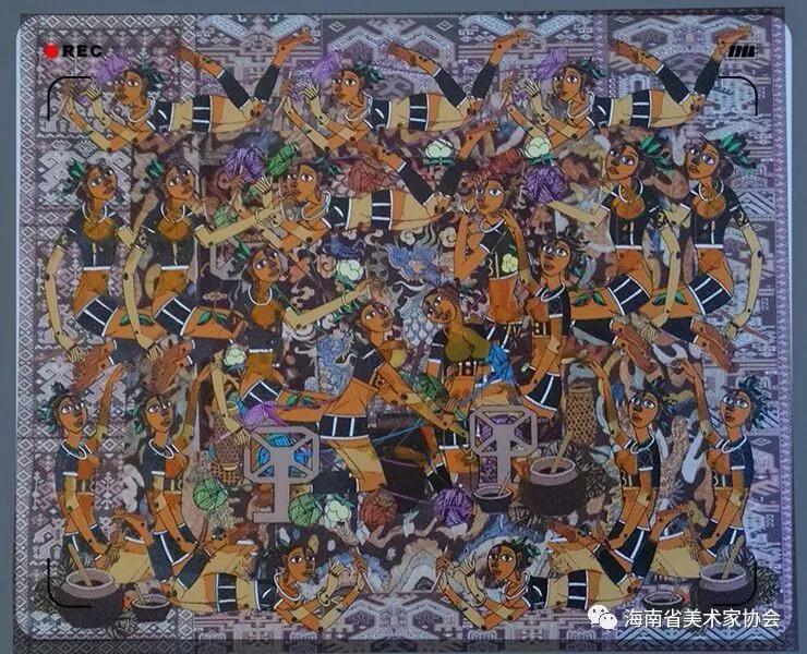 陈:《黎锦织出飞龙舞》作品以黎族的“龙被”飞龙图作为参考和画面背景衬托。中心部份极力打造体现黎族织女们纺、染、织“龙被”时的各种纯朴唯美的婀娜姿态。画面主体部分飞丝走线的黎族织女宛如龙女下凡,在纺织空间游丝走线,彰显黎族织女们个个手巧心灵和楚楚动人的空灵活气。这正是这幅作品画面能特别展现的黎族织锦文化及“非物质”文化的精神所在。
