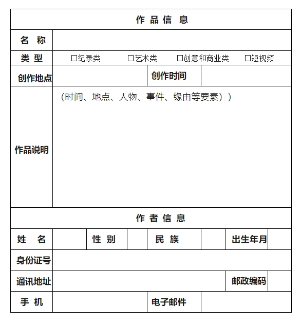 (3)短视频类作品采用MP4或mov格式,作品不得在画面、字幕等内容中显示作者信息。同时附一份投稿信息表(见附件下载),准确填写作品标题、作品说明(200字以内),叙述清晰明了,包括时间、地点、事件等要点,题材符合展览主题,以及作者真实姓名、通讯地址、属地、所在市/省直单位、邮箱、联系方式等相关信息。