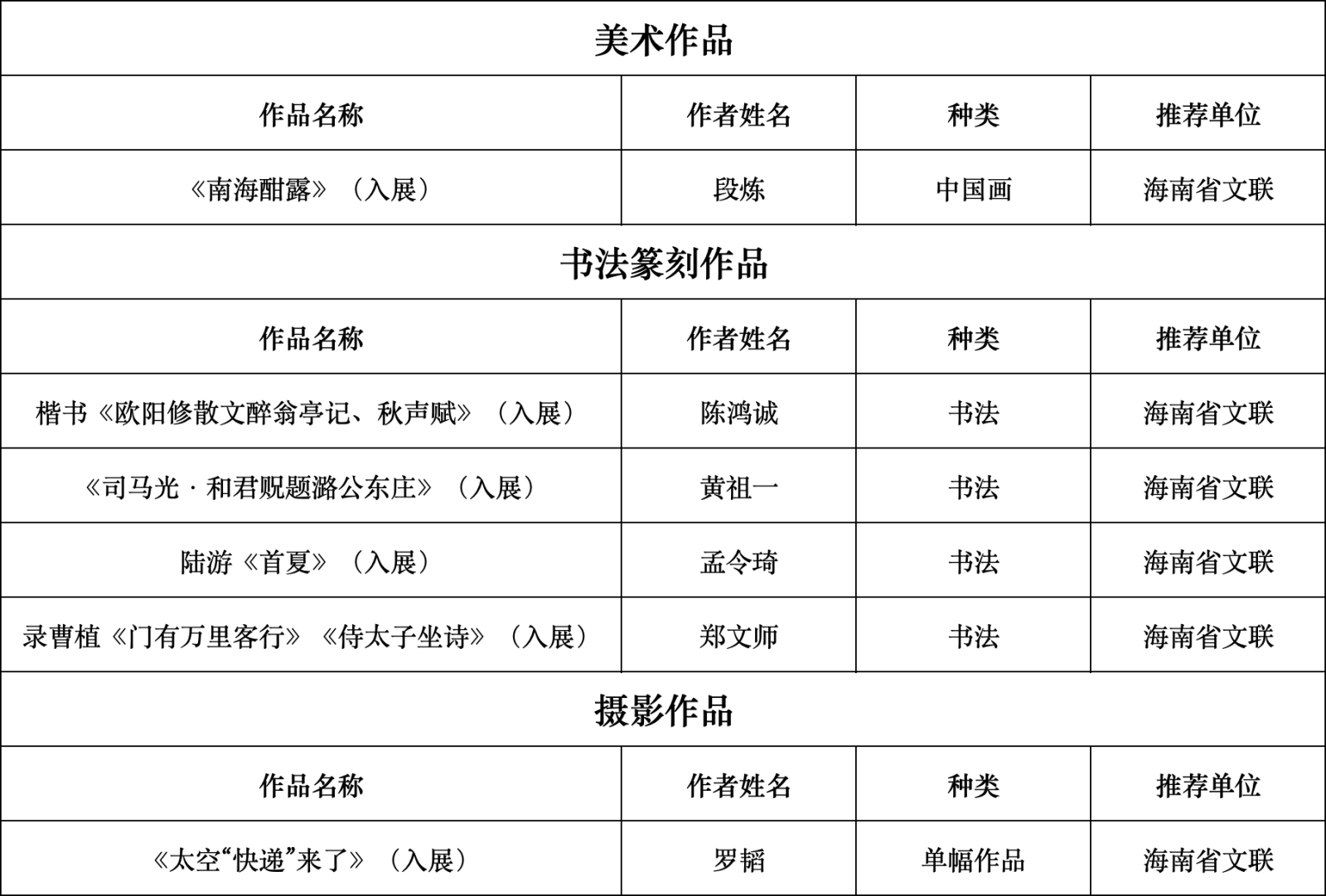第十四届中国艺术节全国优秀美术、书法篆刻、摄影作品展览参展作品名单公布,6件海南省文联推荐作品入展,名单如下。