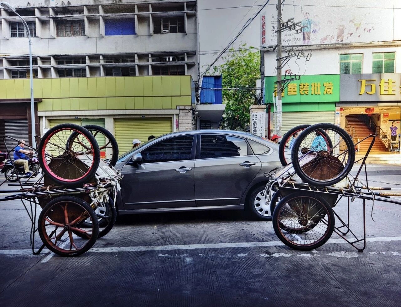 在这场新观念与“无言以对”交织的摄影展览中,海口宛如一颗被岁月精心雕琢,层层包裹的温润明珠,散发着独特而迷人的光彩。自北宋开埠以来,千年岁月如潺潺溪流,在此沉淀出独一无二的城市印记。正如展览前言所写:“这座城市,既是历史的忠实守望者,又是时代的积极弄潮儿。二维码叠映在雕花窗棂之上,传统与现代在此尴尬而又和谐地对视,恰似一场跨越时空的哲学对话;琼剧水袖掠过玻璃幕墙,灵动的传统艺术与冰冷的现代建筑碰撞出奇妙火花,引人深思文化在时代变革中的坚守与灵动;电子秤的荧光照亮古铜色的脸庞,那光芒中既有生活的艰辛,也有对未来的期许,映射出人类在科技洪流中努力找寻自身定位的身影。”