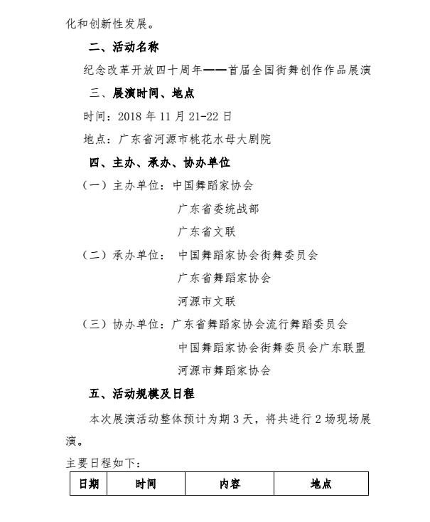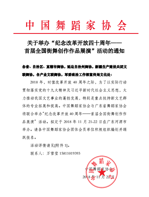 现将《关于举办“纪念改革开放四十周年—— 首届全国街舞创作作品展演”活动的通知 》转发给你们,请按照通知要求报送,作品为原创,请于10月27日前发送到海南省舞协邮箱。