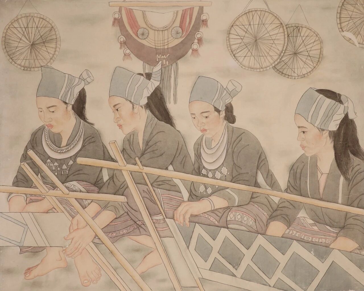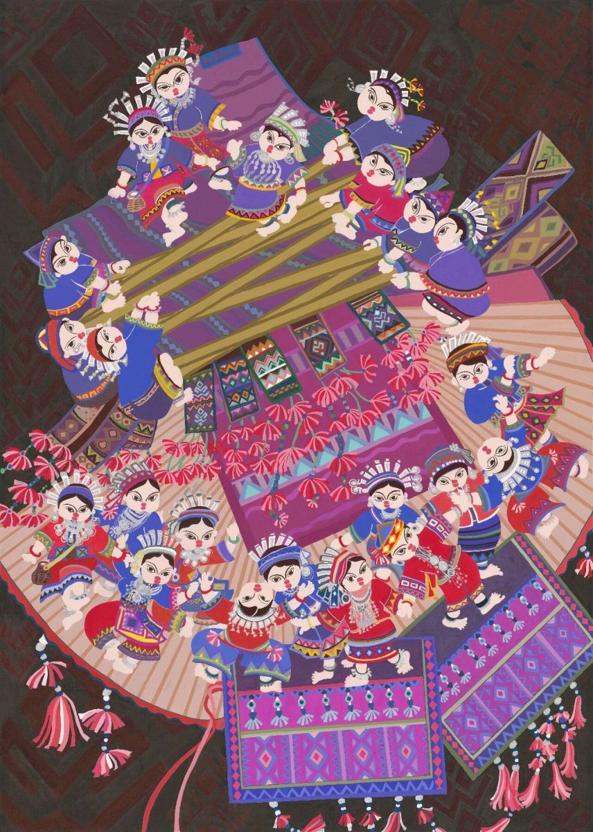 徐永曼立足海南本土民俗文化,围绕疍民文化、黎苗风情、椰风海韵等题材,创作《摘椰图》《疍歌悠悠》《击壤・黎颂》等特色作品。其农民画、新年画质朴灵动、色彩饱满,兼具民间韵味与时代审美,多次入选国家级展览。